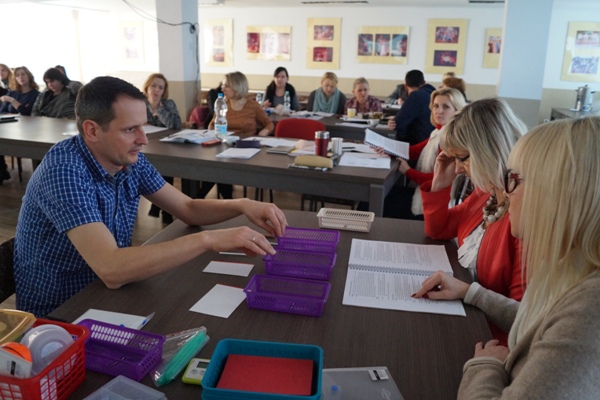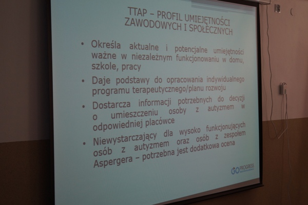 Nauczyciele naszego Ośrodka uczestniczyli w szkoleniu na temat „Diagnoza Funkcjonalna Młodzieży i Dorosłych z Zaburzeniami Rozwoju” - Profil Umiejętności Społecznych TTAP/AAPED. Celem szkolenia było poznanie narzędzia do diagnozy poziomu funkcjonowania młodzieży i dorosłych osób z autyzmem, z zaburzeniami komunikacji oraz innymi zaburzeniami rozwoju oraz poznanie uwarunkowań oraz wymogów rzetelnej i trafnej strategii w konstruowaniu indywidualnego programu terapeutycznego oparciu o wyniki uzyskane w badaniu. Pedagodzy wykonywali ćwiczenia praktyczne realizując wybrane zadania oraz dokonując interpretacji uzyskanych wyników.