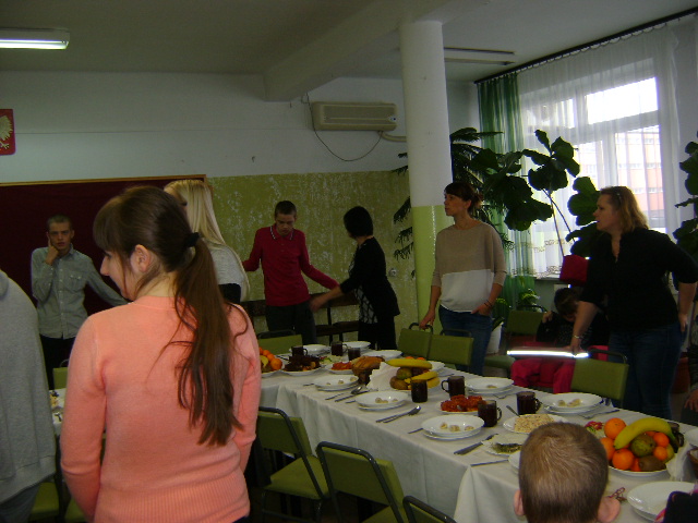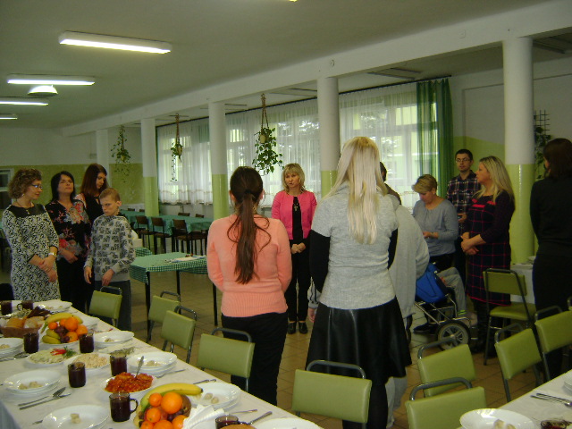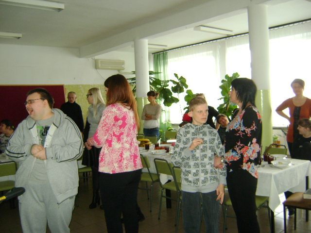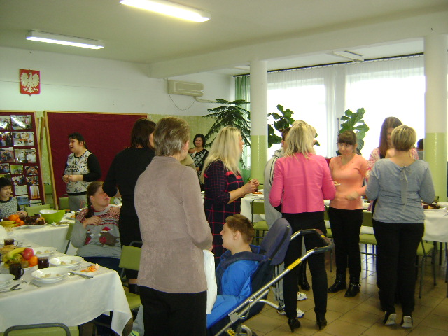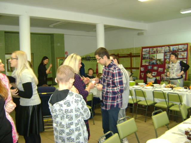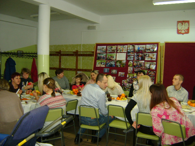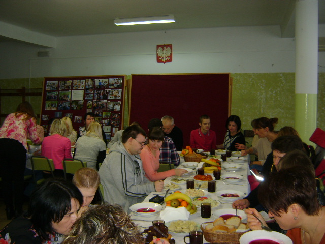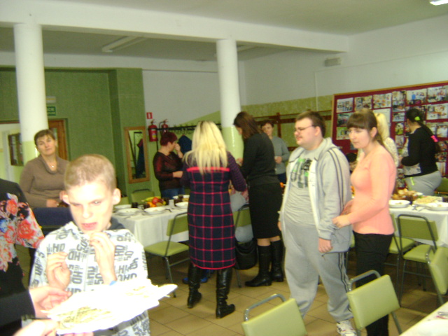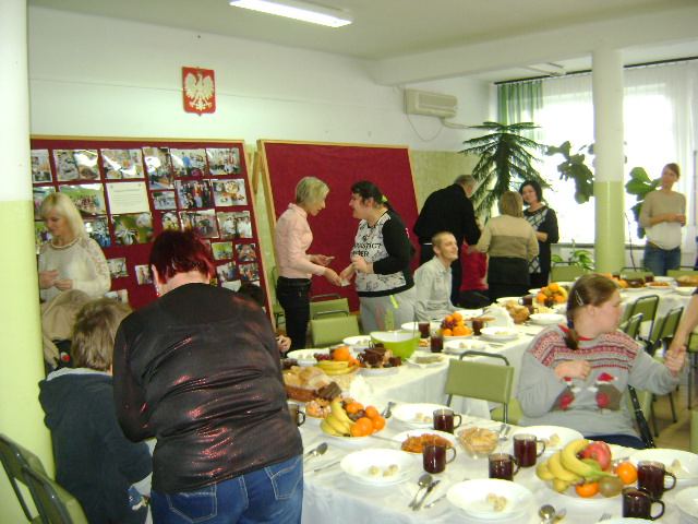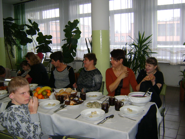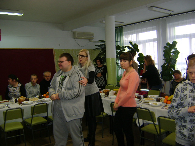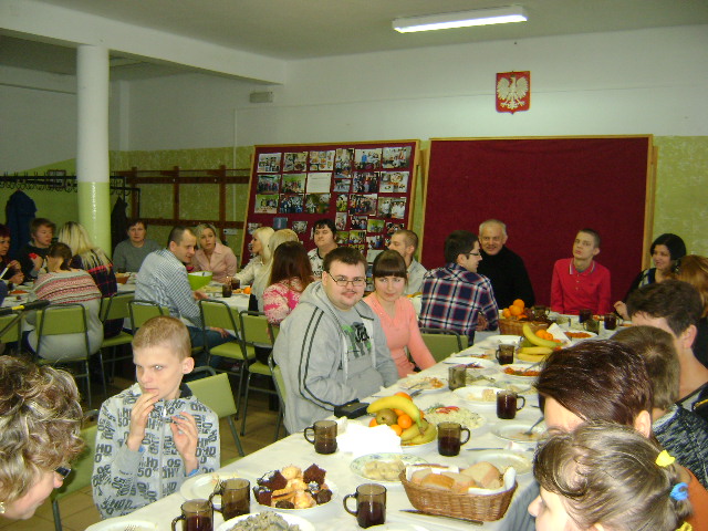 W dniu 16.12.2015 r. w zespołach rewalidacyjno – wychowawczych SOSW odbyła się uroczysta wieczerza wigilijna. Miejscem spożywania uprzednio przygotowanych potraw wigilijnych była stołówka. Rozpoczęcie degustacji poprzedzał uroczysty wstęp do tego wyjątkowego wydarzenia a także odczytanie fragmentu ewangelii św. Łukasza „Narodzenie Pana”, po czym w radosnej i świątecznej atmosferze podzieliliśmy się opłatkiem składając sobie nawzajem szczere, z głębi serca płynące życzenia. Wigilijnym akcentom towarzyszyły kolędy i ogromna radość. Wszystkie zespoły rewalidacyjno – wychowawcze tworzyły w tym wyjątkowym dniu wielką zintegrowaną rodzinę. Rodzice, którzy zaszczycili nas swoją obecnością czynnie uczestnicząc w tym ważnym dla nas wydarzeniu, umacniali nas jeszcze bardziej w przekonaniu, że takie spotkania są ważne i mają niesamowitą głębię i moc w swej istocie.