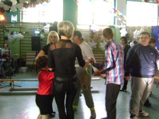 Należy zaznaczyć, iż zabawa była przednia. Dzieci „tańcowały” wraz ze swoimi nauczycielami i rodzicami a trwające, krótkie przerwy między balem uświetniane były uprzednio przygotowanym poczęstunkiem. Pamiątkowe zdjęcia znaczyły kolejny bieg szkolnej historii. Radosna atmosfera podczas tańców udzielała się wszystkim obecnym. Rysująca się radość na buziach wychowanków czyniła choinkę szkolną jeszcze bardziej udaną i wyjątkową. Trochę smutno było kończyć tą wspólną biesiadę.....ale cóż.....miejmy nadzieję, że za rok spotkamy się ponownie.