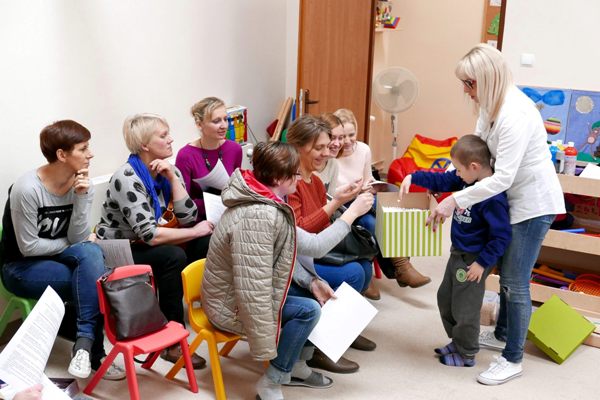 Tematem spotkania było „Jak bawić się z dzieckiem w domu?”. Rodzice poznali kilka przyjemnych sposobów na wsparcie swojego malucha. Zostali zachęceni do wspólnych ćwiczeń i zabaw w domu, które pozwolą na odczuwanie oddziaływań różnorodnych bodźców, a tym samym usprawni poszczególne zmysły i wpłynie na pogłębienie relacji z dzieckiem.