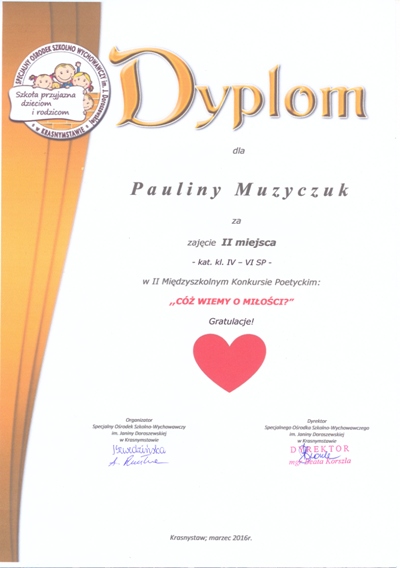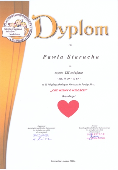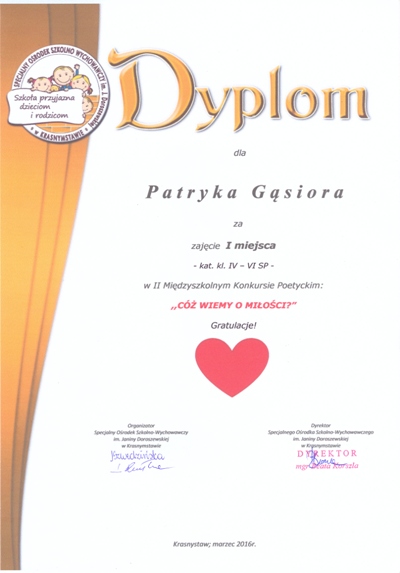 W związku ze Świętem Zakochanych, obchodzonym 14 lutego, w Ośrodku w Krasnymstawie ogłoszono konkurs pod hasłem: "CÓŻ WIEMY O MIŁOŚCI”. Celem konkursu było rozwijanie wyobraźni, uwrażliwianie na drugiego człowieka, popularyzacja twórczości oraz promowanie talentów uczniów z regionu lubelskiego.