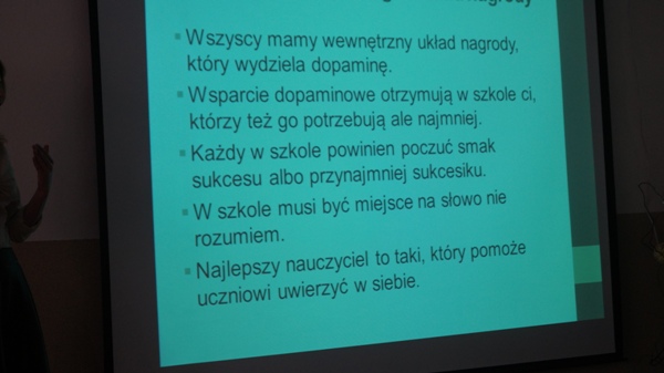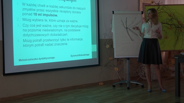 W poniedziałek odbyło sie w naszej placówce bardzo ciekawe szkolenie dla nauczycieli na temat "Neurodydaktyka w w pracy szkolnej" prowadzone przez panią dr Annę Sak-Styczyńską, a zorganizowane przez Centrum Szkoleniowe Metamorfoza. W szkoleniu wzięli udział nauczyciele, wychowawcy oraz pedagodzy pracujący w placówkach oświatowych powiatu hrubieszowskiego. Istotą szkolenia było ukazanie słuchaczom potrzeby zmian w metodach nauczania poprzez wykorzystywanie wiedzy z zakresu neurodydaktyki. Prowadząca przypomniała nauczycielom etapy naturalnego procesu uczenia się oraz wskazała czym jest nauczanie przyjazne mózgowi.