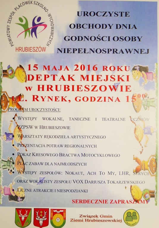 Serdecznie zapraszamy na uroczyste obchody Dnia Godności Osoby Niepełnosprawnej. Uroczystość odbędzie się 15 maja 2016r. o godzinie 15.00 na Deptaku Miejskim ul. Rynek w Hrubieszowie.