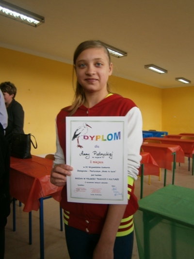W środę uczniowie naszego ośrodka uczestniczyli w IX Wojewódzkim Konkursie Plastyczno - Ekologicznym WODA TO ŻYCIE, zorganizowanym przez Zespół Placówek w Łukowie.Tegoroczna edycja konkursu odbyła sie pod hasłem "Bocian w tradycji i kulturze Polskiej". Uczniowie samodzielnie wykonywali prace konkursowe, które oceniało Jury. Anna Pietrycka zdobyła I miejsce, a Adam Opszyński i Grzegorz Pietrycki otrzymali wyróżnienia. Wszyscy artyści otrzymali nagrody.
