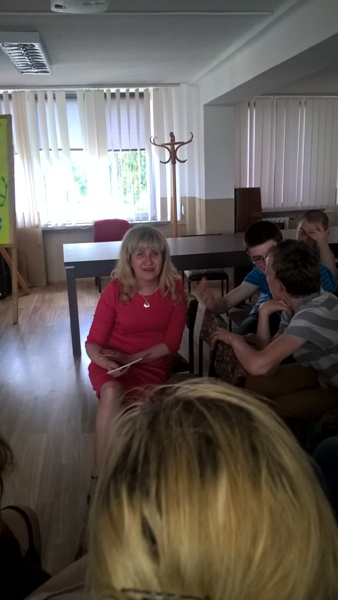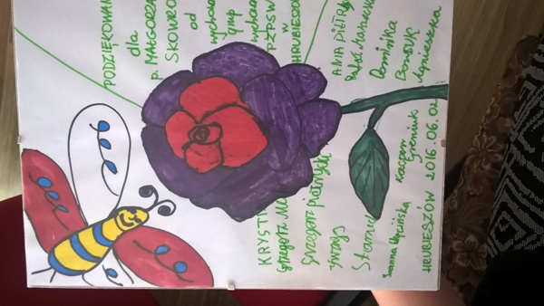Dnia 2 czerwca 2016 roku wychowankowie grup wychowawczych uczestniczyli w spotkaniu z Małgorzatą Skowron - poetką i pisarką z Hrubieszowa, laureatką prestiżowych nagród w konkursach ogólnopolskich i międzynarodowych. Autorką tomików „Marzenia nie mieszczące się w tornistrze ” (2003), „Dokąd wiodą ścieżki fantazji” (2004), „W krainie, gdzie czas miło płynie” (2007), „Bajkowy kuferek” (2011) oraz ,,Drzwi do przygody”. Pani Małgorzata w bardzo interesujący i ciekawy sposób zaprezentowała swoje utwory, w których dominował humor i zabawa słowem. Szybko zdobyła serca młodych słuchaczy. Nie zabrakło też pytań, na które chętnie odpowiadała.Uczestnicy teatrzyku ,,Radość” mieli okazję zaprezentować wiersze poetki ,a następnie grupowo wykonać ilustracje do wiersza ,, Biedronka”. W podziękowaniu za bardzo ciekawe spotkanie wychowankowie wręczyli poetce prace plastyczne z ilustracjami niektórych wierszy autorki.