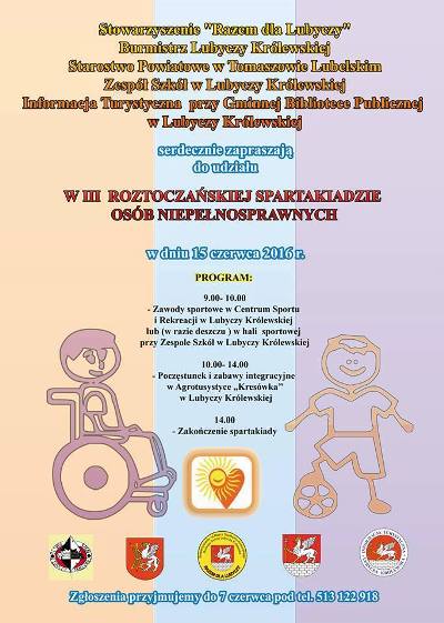 W dniu 15 czerwca 2016 roku uczniowie klasy I gimnazjum, I PDP i V/VI SP SOSW w Hrubieszowie, mieli przyjemność uczestniczyć w III Roztoczańskiej Spartakiadzie Osób Niepełnosprawnych w Lubyczy Królewskiej.