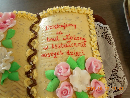 Następnie słowa podziękowania i życzenia złożyli Rodzice naszych uczniów, a uwieńczeniem spotkania był poczestunek przy kawie: wspaniały tort oraz przepyszne ciasta przygotowane przez rodziców.