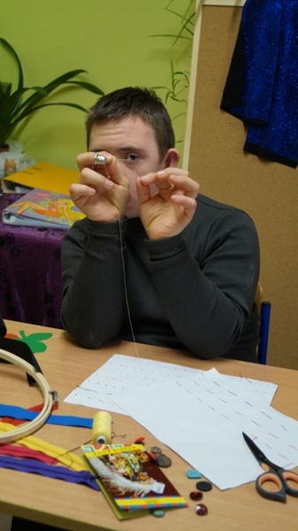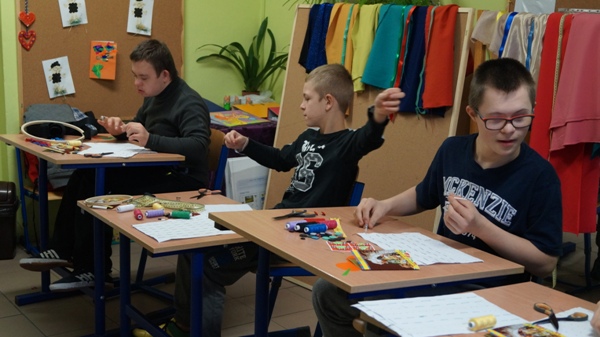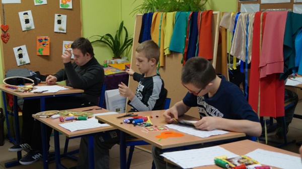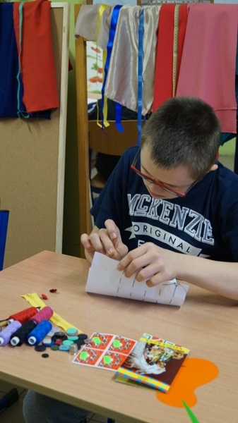 Do zajęć zostały zakupione: różnorodne materiały, nici do szycia ręcznego i maszynowego, naparstki, nożyce, miary krawieckie, guziki(z dziurkami i na stopce), zatrzaski, napy, rzepy, haftki, kolorowe materiały, filc (tło do szytych obrazów), zamki błyskawiczne, krzywiki, linie, pergamin, szpilki, naparstki, radełka, kreda krawiecka, mydełko krawieckie. Warsztaty prowadzi pani Marzenna Litwiniuk - Mizerska