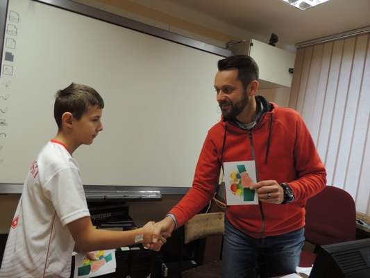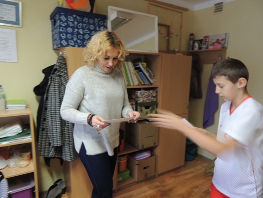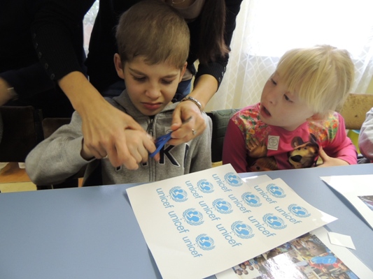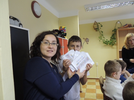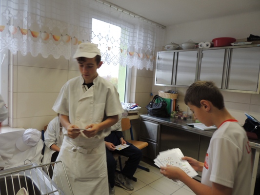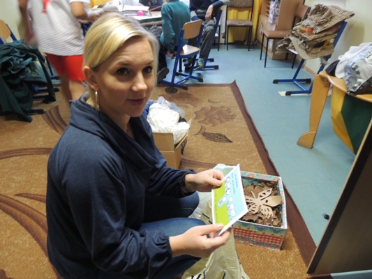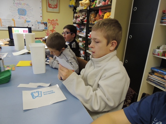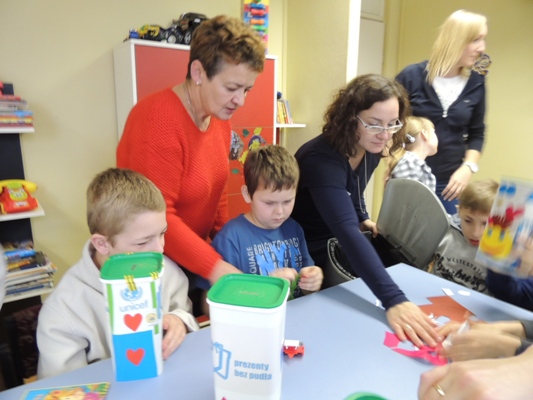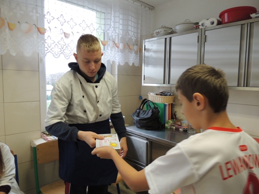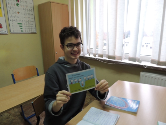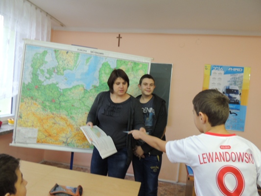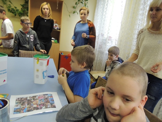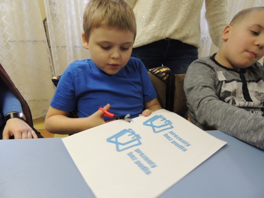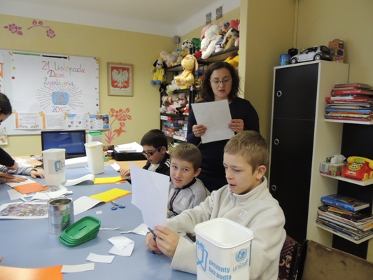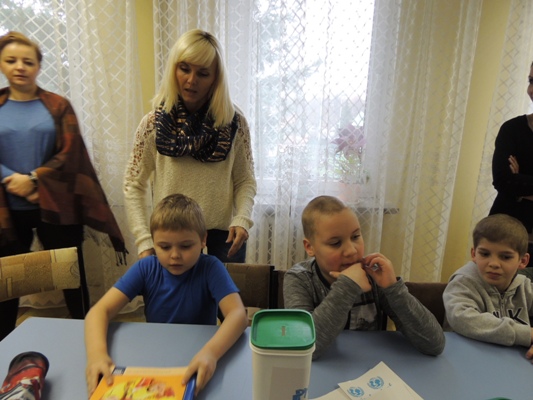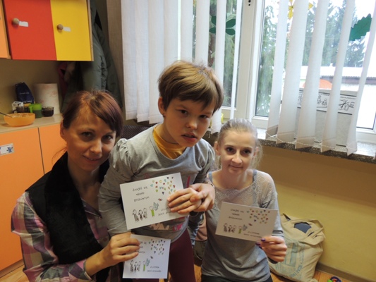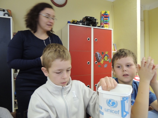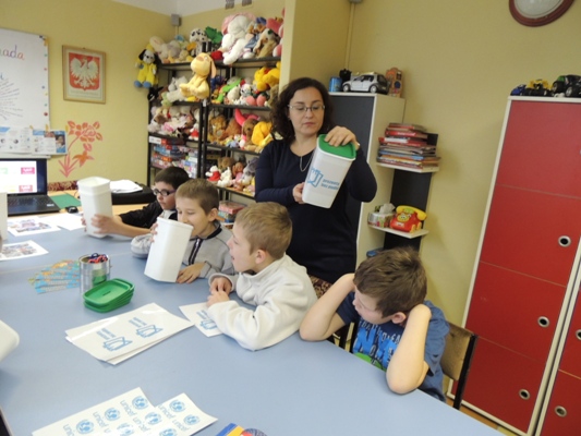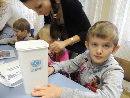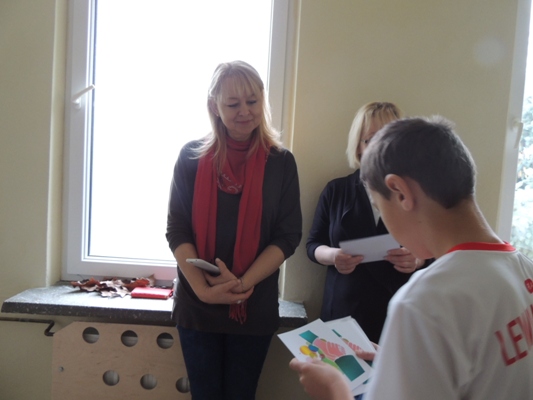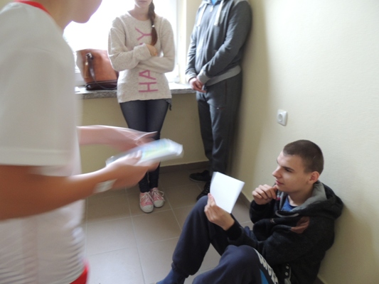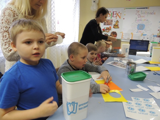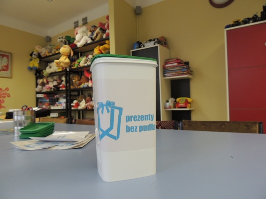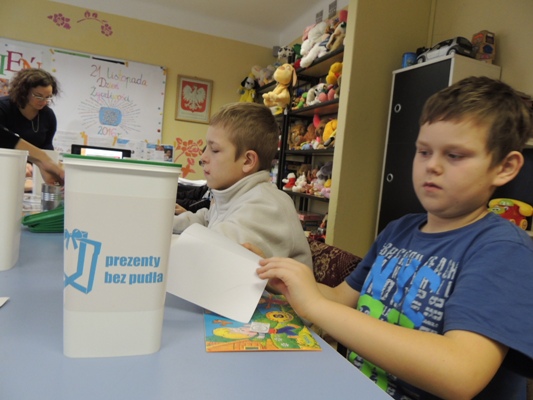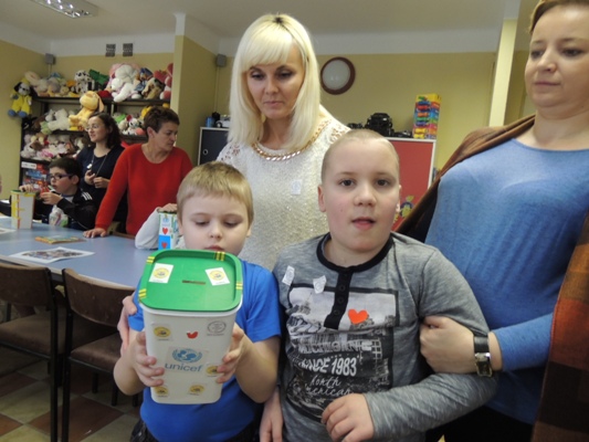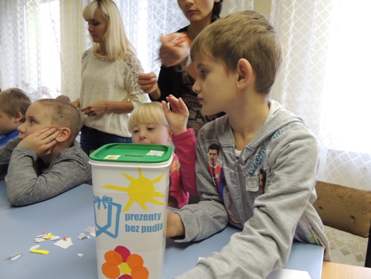 Uczestnikom spotkania zostały wręczone kartki promujące akcję by mogli podzielić się nimi, pozytywną energią w szkole z kolegami i koleżankami. Chętni uczniowie zbierali pieniądze do przygotowanej podczas spotkania puszki akcji ,,Prezent bez pudła” UNICEF.