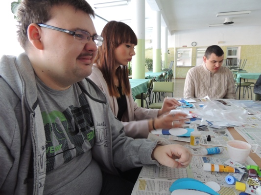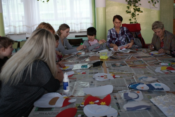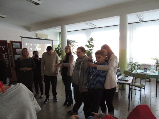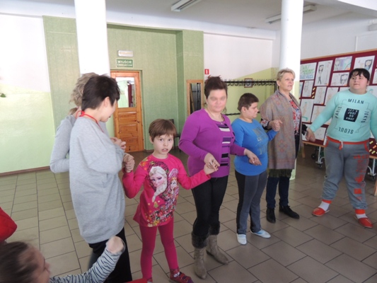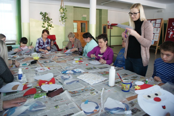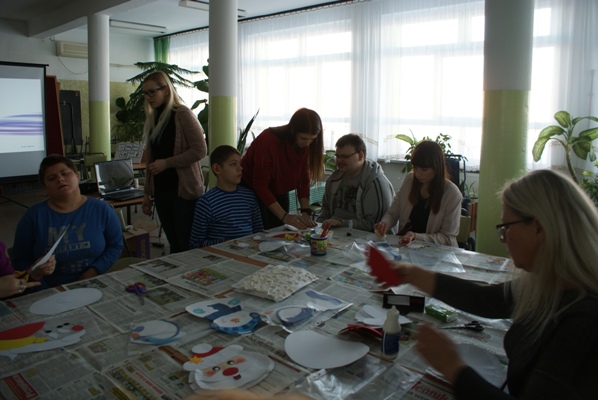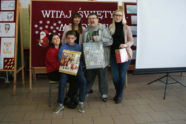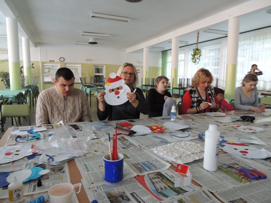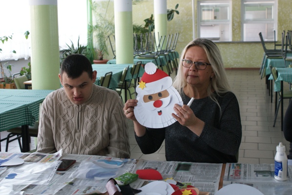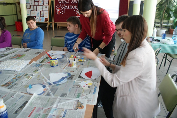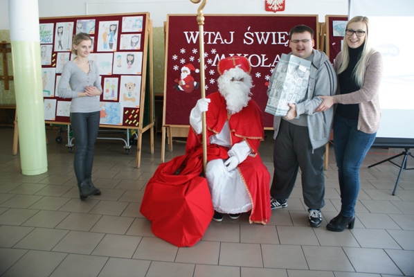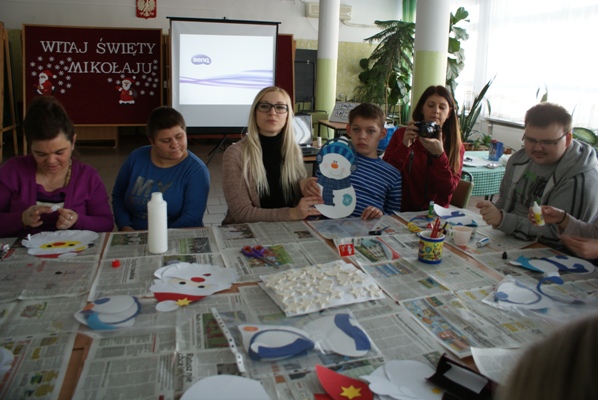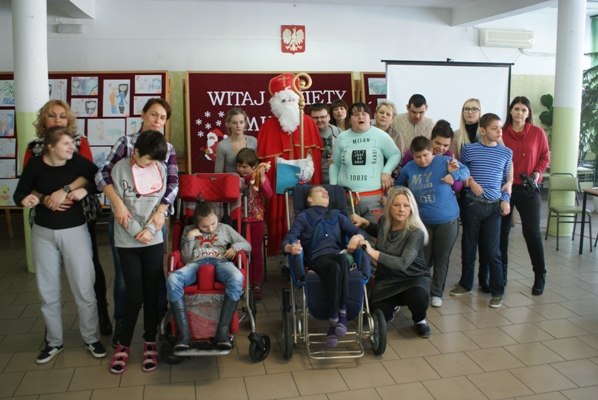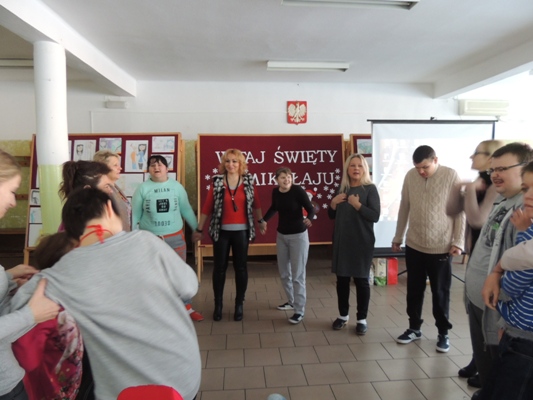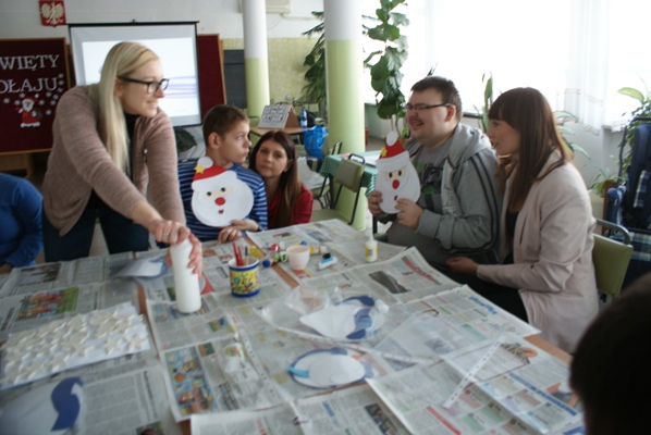 Dnia 05.12.2016r dzieci i młodzież z zespołów rewalidacyjno – wychowawczych uczestniczyła w zajęciach integracyjnych. Scenariusz zajęć obejmował wspólne śpiewy i zabawy w kole a także prace plastyczne o tematyce świątecznej. Dowiedzieliśmy się również, że dzisiaj odwiedzi nas Święty Mikołaj. Uczniowie z zainteresowaniem i uśmiechem na twarzy wspólnie z wychowawcami wyklejali kolorowe Mikołaje i bałwanki. W międzyczasie odbyła się projekcja bajki „Święta u świnki Peppy”, dzięki której wychowankowie dowiedzieli się jak wyglądają przygotowania do Świąt Bożego Narodzenia.