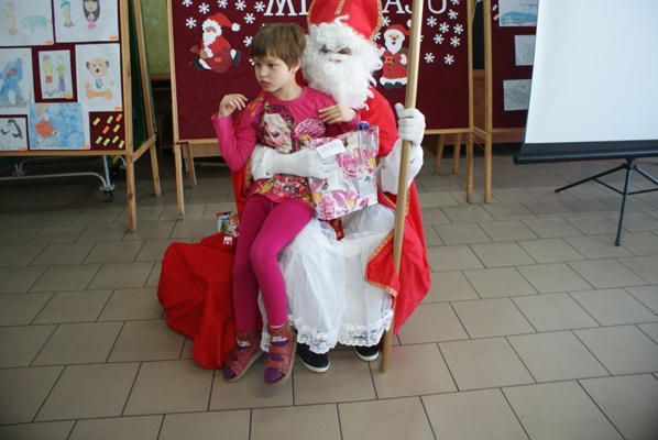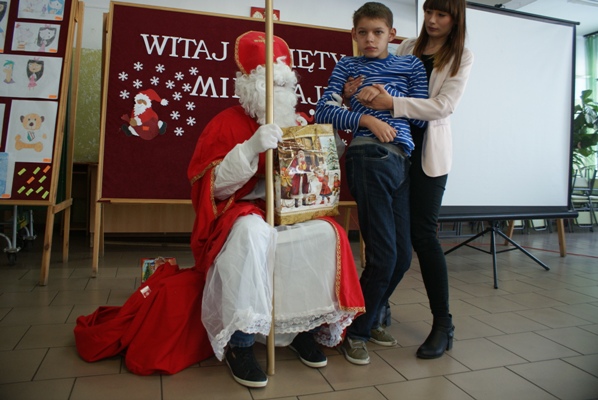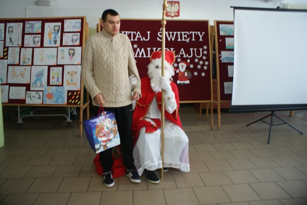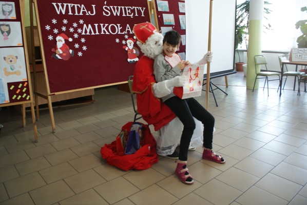 Nadszedł wreszcie długo oczekiwany moment. Święty Mikołaj nie zawiódł dzieci i nie kazał długo na siebie czekać. Kiedy pojawił się w drzwiach uczniowie wspólnie wykrzyknęli jego imię. Święty Mikołaj obdarowując wymarzonymi prezentami opowiadał jak długą drogę musiał przebyć aby do nas dotrzeć. Serdecznym uśmiechom i okrzykom radości nie było końca. Miłym akcentem naszego spotkania były wspólne zdjęcia z naszym gościem. Dzieci długo wspominały ten dzień, dzieliły się wrażeniami, ponownie oglądały upominki, zerkały przez okno z nadzieją, że jeszcze raz zobaczą Świętego Mikołaja i pomachają mu na pożegnanie.