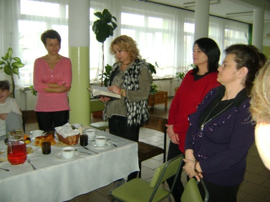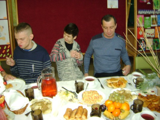 Wieczerzę wigilijną rozpoczęliśmy odczytaniem fragmentu Pisma świętego, dotyczącego narodzin Jezusa, przełamaniem się opłatkiem jak również składaniem wzajemnych życzeń. Wieczerzę spożywaliśmy w atmosferze rodzinnej, świątecznej pełnej powagi, refleksji, zadumy i radości. Stoły przykryte białymi obrusami z wiązką siana pod spodem i z ustawionym jednym dodatkowym nakryciem dla nieproszonego gościa przypominały, iż czas Bożego Narodzenia, tak bardzo przez wszystkich oczekiwany jest tuż….tuż… Radosny dźwięk kolęd wprowadzał wszystkich w nastrój wyjątkowy i bardzo radosny. ….