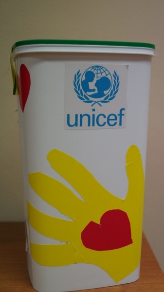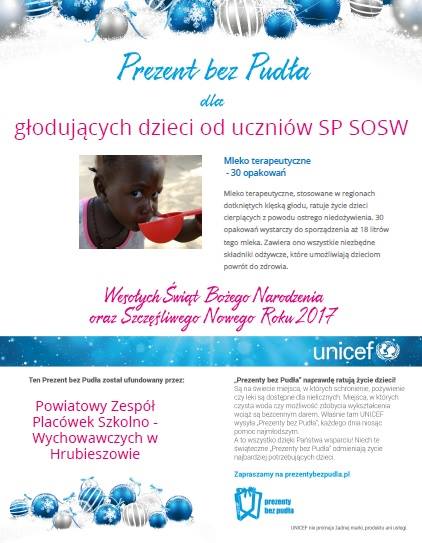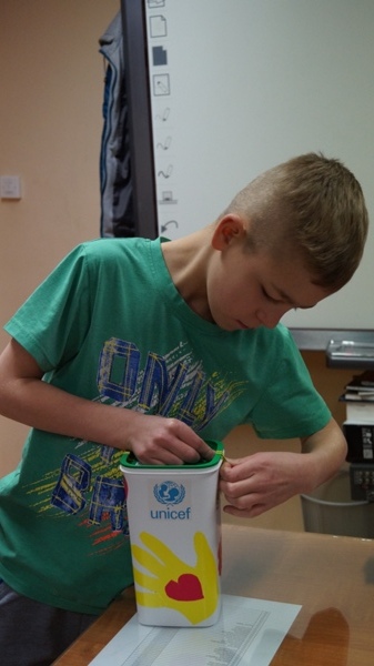 Uczniowie szkoły podstawowej przyłączyli się do akcji UNICEF „Prezenty bez pudła”. Zbierali pieniążki do specjalnie przygotowanych puszek. Dzieci wspólnie przeliczyły zebrane datki i przeznaczyły je na zakup mleka terapeutycznego stosowanego w regionach dotkniętych klęską głodu, ratującego życie dzieci cierpiących z powodu ostrego niedożywienia.