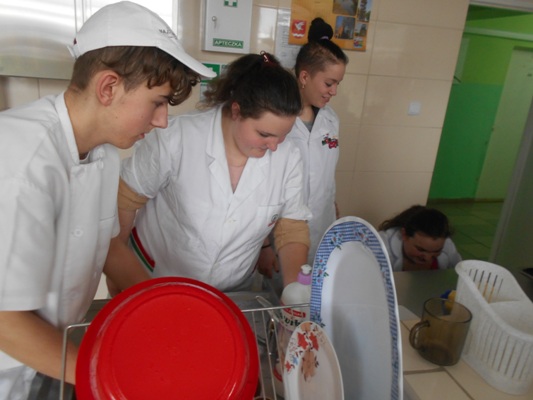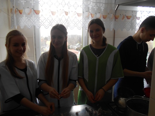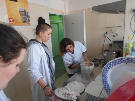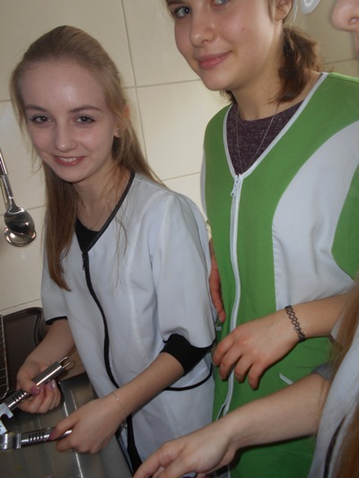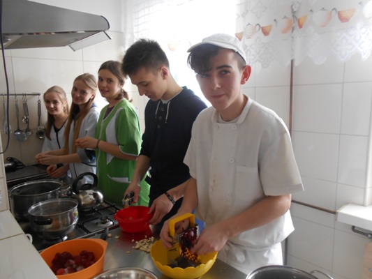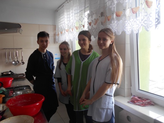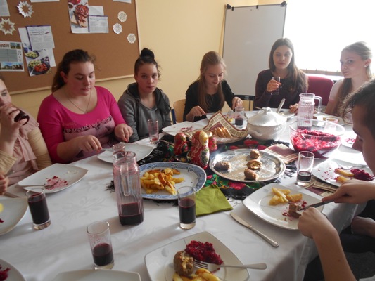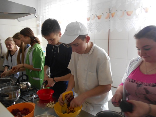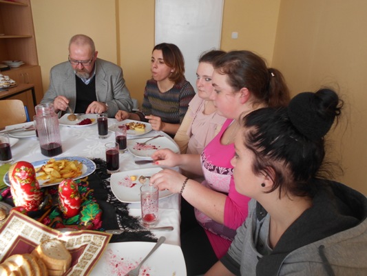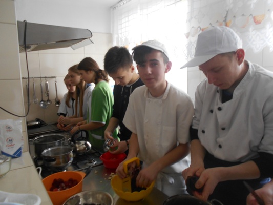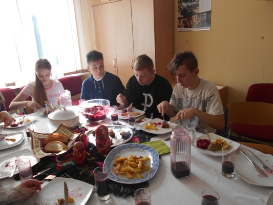 Tłusty czwartek w naszej szkole był jednocześnie dniem poznania smaków kuchni rosyjskiej. W nasze progi zawitali uczniowie gimnazjum z Zespołu Szkół nr 2 w Hrubieszowie pod opieką Pani Neonilii Pawluk. Wspólnie z uczniami naszej placówki przygotowali tradycyjne dania rosyjskie. Byli to: nieszablonowy kapuśniak, domowe zrazy, ziemniaczki po wiejsku oraz surówka z buraczków i jabłek. Oczywiście zajęcia kulinarne odbywały się zarówno w języku polskim jak i w języku rosyjskim. Młodzież poznała rosyjskie nazwy przyrządów kuchennych, składniki przepysznych dań i wreszcie mogła poczuć prawdziwy klimat tamtejszej kuchni. Z pewnością oprócz nowych smaków uczniowie poznali również nowe nieznane im dotąd zwroty i wyrażenia z języka rosyjskiego. Cała kilkugodzinna przygoda z językiem rosyjskim upłynęła nam w niezwykle miłej i koleżeńskiej atmosferze. Wszyscy bawili się wspaniale, a przy tym uczyli się wielu ciekawych rzeczy. Najprzyjemniejszą częścią spotkania była oczywiście degustacja. Pyszności zaserwowane przez młodzież i super przygoda skłoniła wszystkich do zaplanowania ponownego spotkania w okresie Wielkanocnym. Wtedy to zaprezentujemy świąteczne rosyjskie przysmaki.