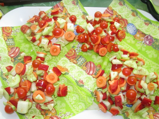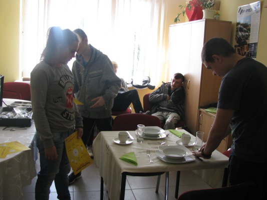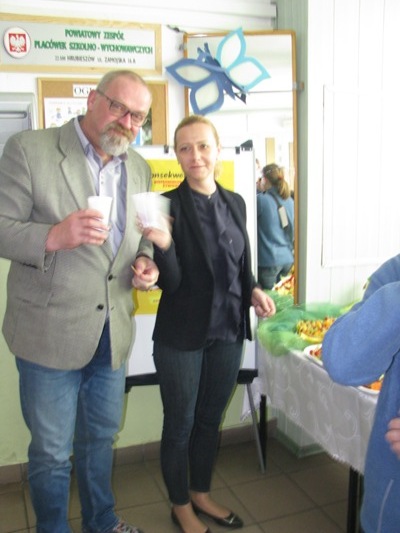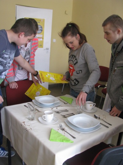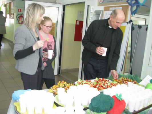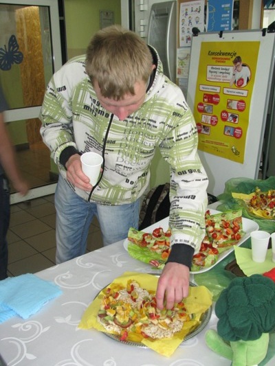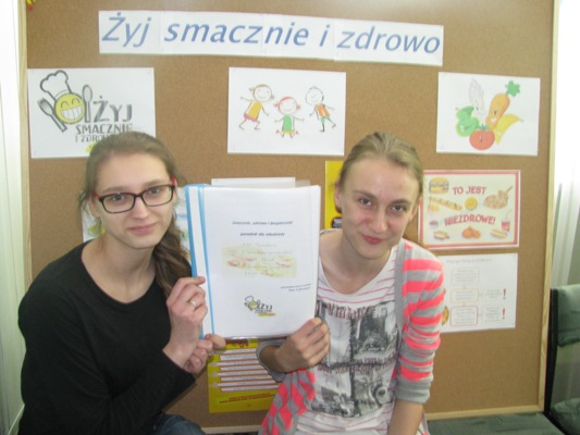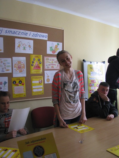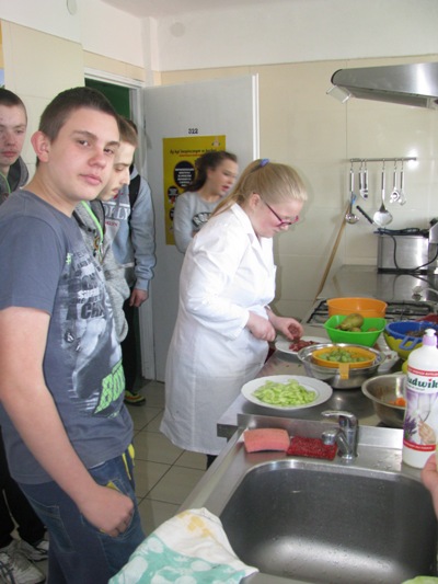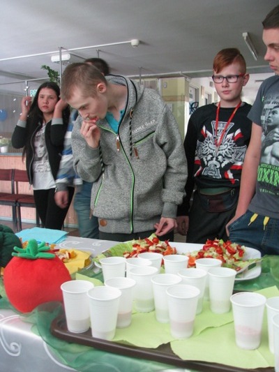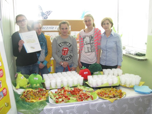 Uczniowie klasy II pod opieką pani A. Kozickiej i M. Szczuckiej wzięli udział w cyklicznych spotkaniach promujących zdrowy tryb życia. Podczas zajęć edukacyjnych zdobyli ciekawe informacje dotyczące zdrowego trybu życia, zdrowego odżywiania. Przeprowadzono zajęcia pt.:”Rzecz o bezpieczeństwie w kuchni i dobrych manierach przy stole”, których celem było zapoznanie uczniów z bezpieczeństwem i higieną pracy podczas przygotowywania posiłków oraz zapoznanie z tajnikami Savoir-vivre czyli zasadami nakrywania i podawania do stołu oraz jedzenia i picia. Dzięki uprzejmości starszych kolegów uczniowie gimnazjum mogli uczestniczyć w zajęciach otwartych prowadzonych w pracowni kulinarnej, gdzie zgłebiali tajniki smacznego i zdrowego przygotowywania posiłków. Uczniowie, którzy kształcą się w zawodzie kucharz, chętnie dzielili się własnym doświadczeniem i wiedzą. Następnym etapem działań, były przygotowane przez uczniów według własnego pomysłu zdrowe koktajle owocowe, przekąski z owoców i warzyw w formie koreczków, które zaprezentowano dla całej społeczności szkolnej. Gimnazjaliści z ogromnym zaangażowaniem i skupieniem prowadzili kącik promujący spożywanie owoców i warzyw. Z przygotowanego asortymentu zdrowych przekąsek i koktajli korzystali przedszkolaki , uczniowie szkoły podstawowej oraz gimnazjaliści i uczniowie zasadniczej szkoły zawodowej oraz goście odwiedzający nasz ośrodek. Stoisko było różnobarwne, przygotowane na wysokim poziomie zarówno pod względem estetycznym jak i z zachowaniem zasad racjonalnego żywienia oraz łączenia produktów spożywczych. Podsumowaniem naszej akcji jest wydanie poradnika dla młodziezy pt.”Smacznie, zdrowo i bezpiecznie” przygotowanego przez uczniów klasy II gimnazjum, który został zaprezentowany podczas promocji zdrowych przekąsek, ponieważ celem takiego wydarzenia jest uświadomienie wszystkim, nie tylko społeczności szkolnej, ale także lokalnej, dobrych praktyk związanych ze zdrowym żywieniem.