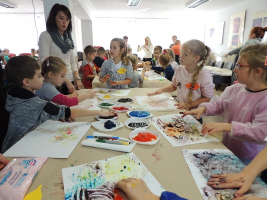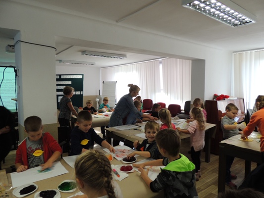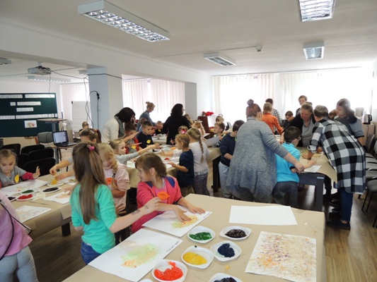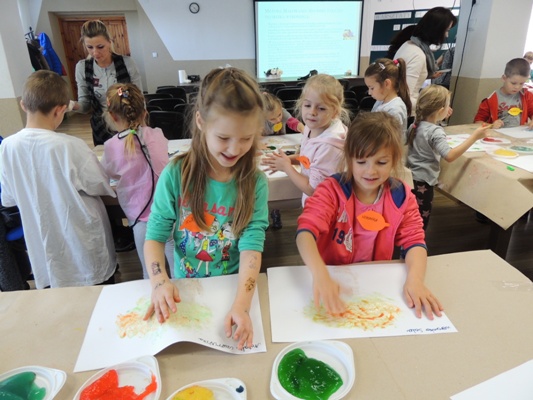 „W jesiennej szacie” pod takim tytułem w dniu 26 października 2017 r. odbyły się zajęcia warsztatowe, integrujące klasy szkoły podstawowej oraz grupę przedszkolną „Piraci” z Przedszkola Miejskiego Nr 1 w Hrubieszowie. W czasie spotkania dzieci wysłuchały opowieści o jesieni, wzięły udział w quizie na temat jesiennych barw. Z niesamowitym zaangażowaniem wykonywały prace plastyczne z wykorzystaniem niecodziennej Metody Malowania Dziesięcioma Palcami.