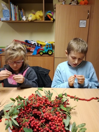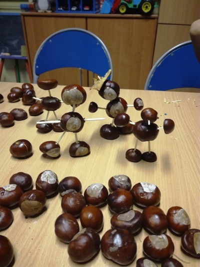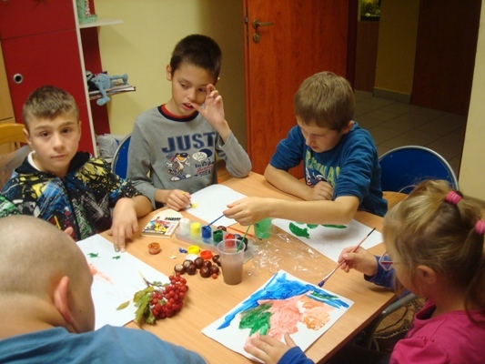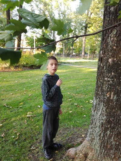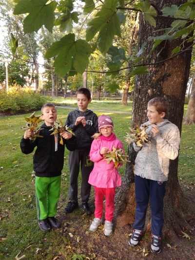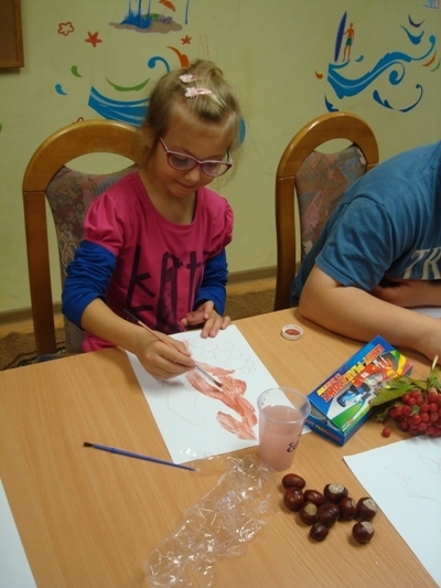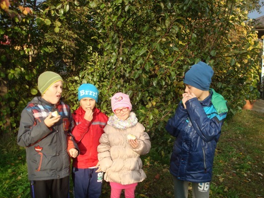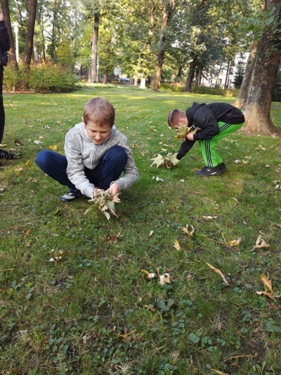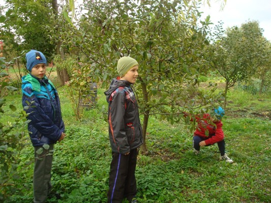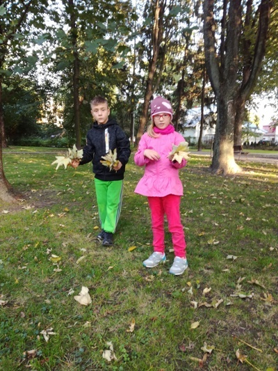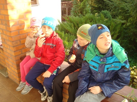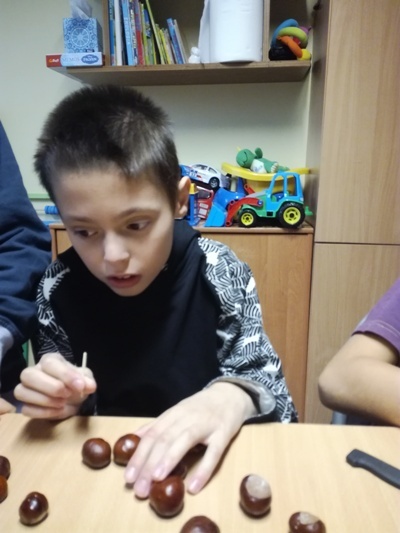 Wychowankowie grupy I uczestniczyli w cyklu zajęć, których głównym celem było poznanie cech charakterystycznych dla pory roku, jaką jest jesień oraz wielozmysłowe poznanie darów jesieni. Maja, Staś, Emek i Krzyś wraz z wychowawcami odwiedzili Park Miejski w Hrubieszowie, a także sad w gospodarstwie na osiedlu Michałówka. Największą radość sprawiło jednak wyjście do lasu „Dębinka” w Hrubieszowie. W miejscach tych wychowankowie zbierali grzyby, kasztany, żołędzie, jarzębinę, jabłka, śliwki i gruszki. Z darami jesieni wychowankowie zapoznali się za pomocą zmysłów, takich jak: wzrok, słuch, smak, dotyk i węch. Przyniesione przedmioty zostały wykorzystane do stworzenia ludzików z kasztanów, korali z jarzębiny oraz sałatki owocowej. Podczas zajęć o tematyce jesiennej wychowankowie przede wszystkim rozwijali koordynację wzrokowo – ruchową, ćwiczyli precyzję ruchów rąk, ćwiczyli spostrzegawczość, ćwiczyli rozpoznawanie kolorów i kształtów, a także poprawiali sprawność manualną. Zajęcia te były również okazją do powtórzenia i utrwalenia nazw drzew, rodzajów grzybów oraz nazw kolorów. Wyjścia na spacer stwarzają nam także okazję do dotlenienia organizmu i nauki samodzielnego ubierania oraz rozbierania się.