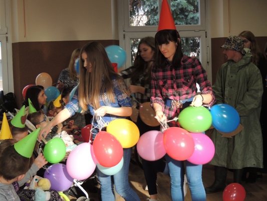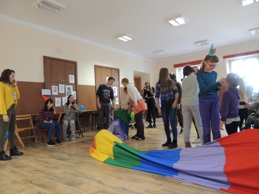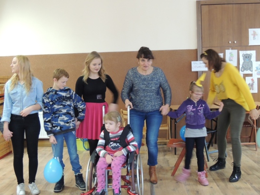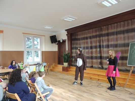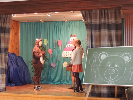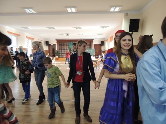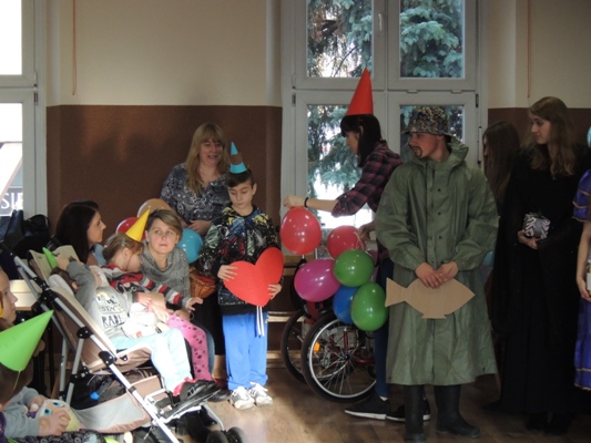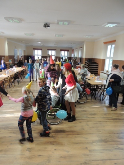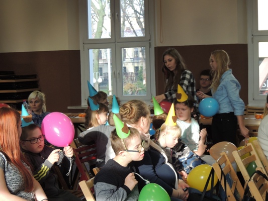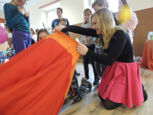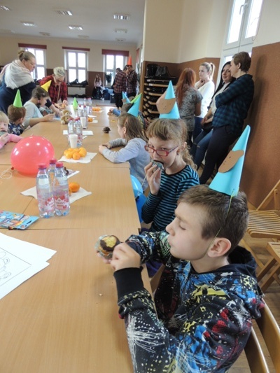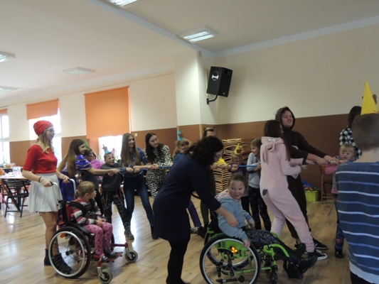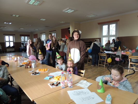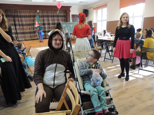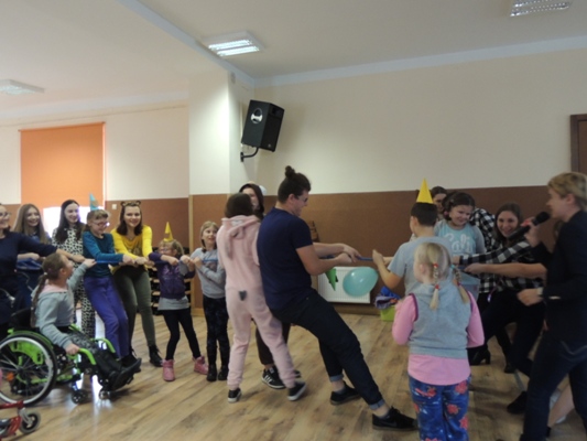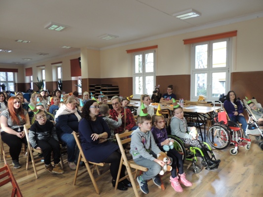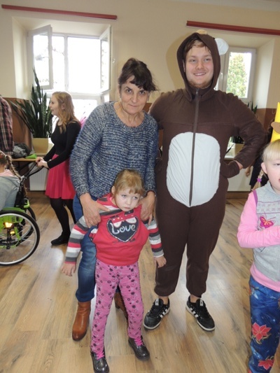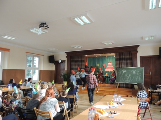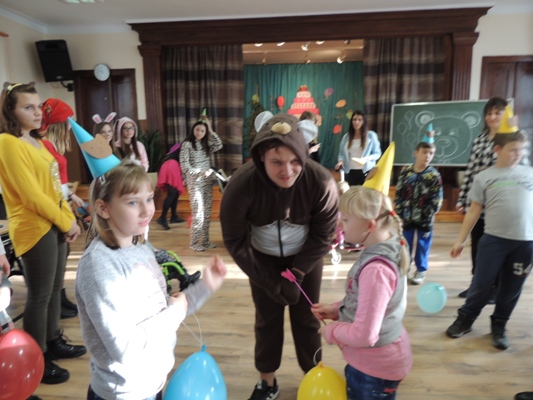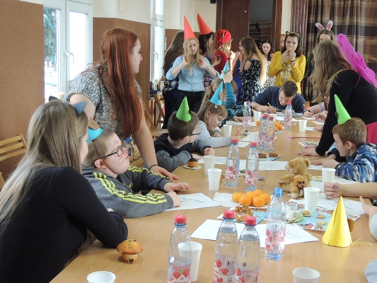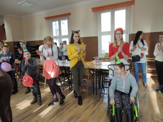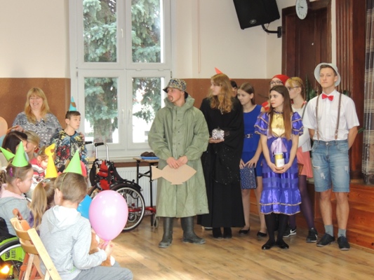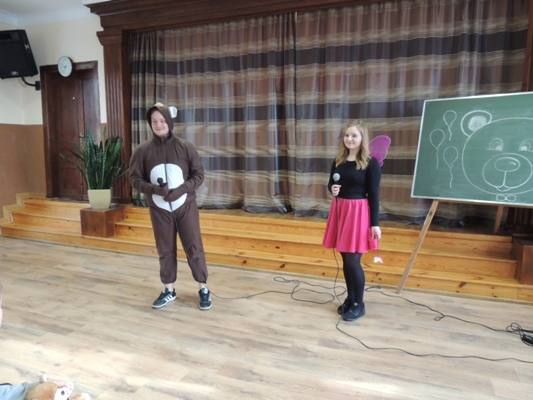 Uczniowie szkoły podstawowej naszego Ośrodka poniedziałkowe przedpołudnie zostali zaproszeni na wyjątkowe Urodziny Misia zorganizowane przez młodzież z klasy IID Liceum Ogólnokształcącego im. Ks. Stanisława Staszica z okazji Światowego Dnia Pluszowego Misia. Licealiści przygotowali bajkowe przedstawienie z uroczym misiem w roli głównej i wielobarwnym orszakiem postaci z bajek i baśni. Wspólnie dekorowaliśmy salę, wręczaliśmy prezenty, odśpiewaliśmy 100 lat! Następnie była misiowa uczta, tańce oraz zabawy z chustą i kolorowym tunelem. Przeciąganie liny wywołało salwy śmiechu. Miłośnicy plastyki mogli kolorować przygotowane misiowe malowanki.