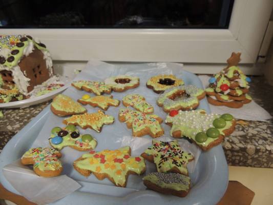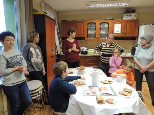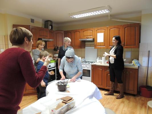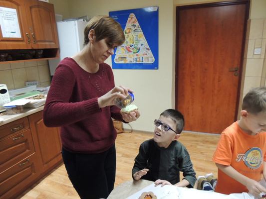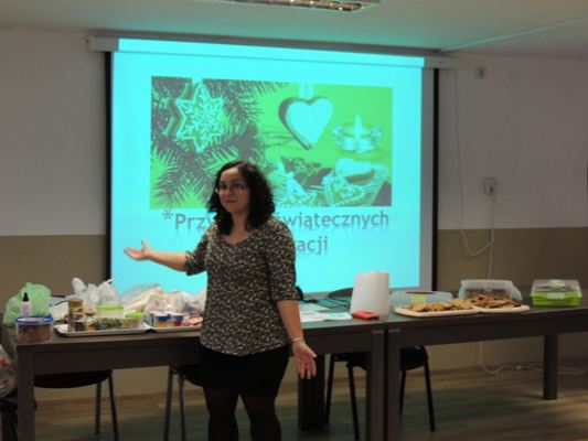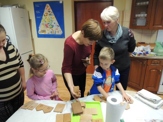 Rodzice obejrzeli związaną z tematem prezentację multimedialną. Uczestnicy warsztatów osłuchali się z legendami o toruńskich piernikach (Bartłomieju zakochanym w Rózi, Katarzynce), poznali cukiernicze nazewnictwo dotyczące pierników (Uchatka, Katarzynka), zdobyli przepis na sprawdzone ciasto oraz mieli okazję zainspirować się zdjęciami ozdobnie wykonanych świątecznych pieników by następnie w części praktycznej samodzielnie podjąć się zdobienia pierników.