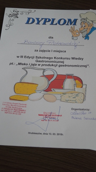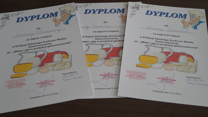 W dniu 13 marca 2018 r. odbył się III Szkolny Konkurs Wiedzy Gastronomicznej pt. "Mleko i jaja w produkcji gastronomicznej". W konkursie wzięli udział uczniowie klas II i III Zasadniczej Szkoły Zawodowej. Celem konkursu było sprawdzenie wiedzy naszych uczniów z zakresu technologii gastronomicznej. Zwyciężcami konkursu zostali: