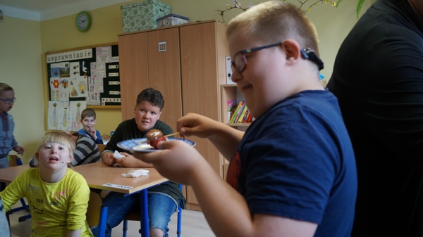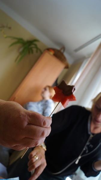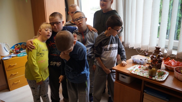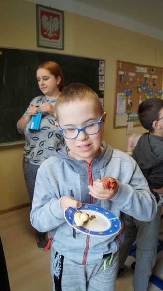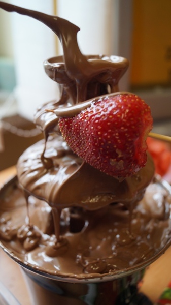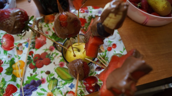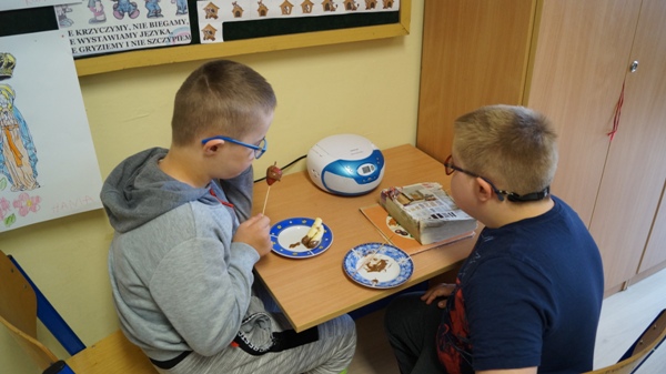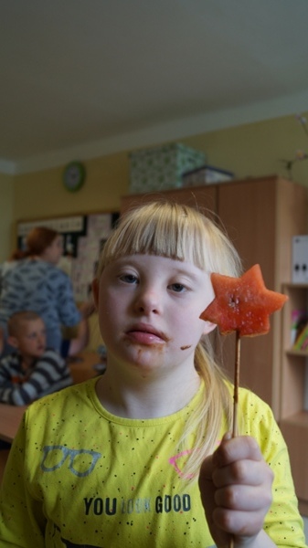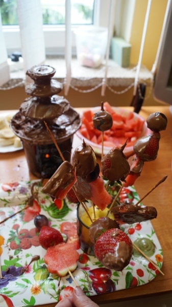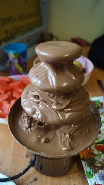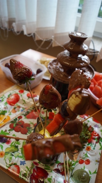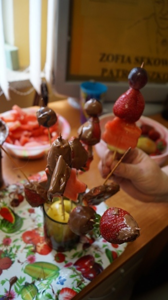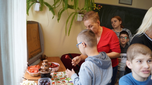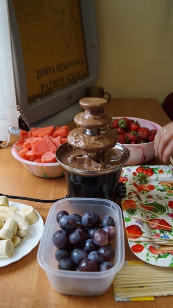 Najmłodsi uczniowie szkoły podstawowej w piątek, urządzili warsztaty czekoladowo - owocowe. Bohaterem spotkania była fontanna z mleczną czekoladą oraz zdrowe i pyszne owoce a wśród nich truskawki, arbuz, winogrona, banany. Wielbiciele czekolady ucztowali z wielkim apetytem. Z pozostałej czekolady powstały nadziewane pralinki, którymi dzieci poczęstują swoich bliskich.