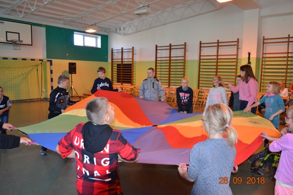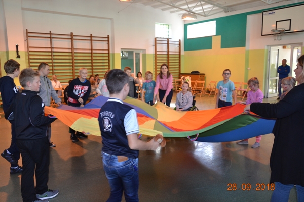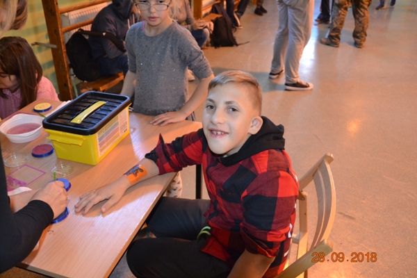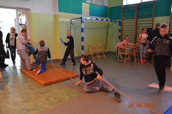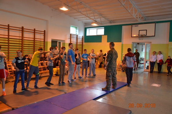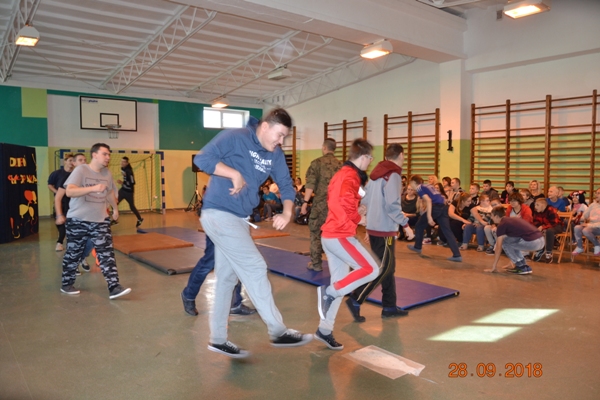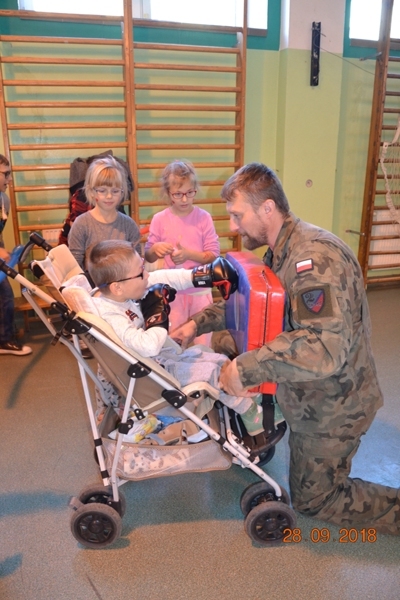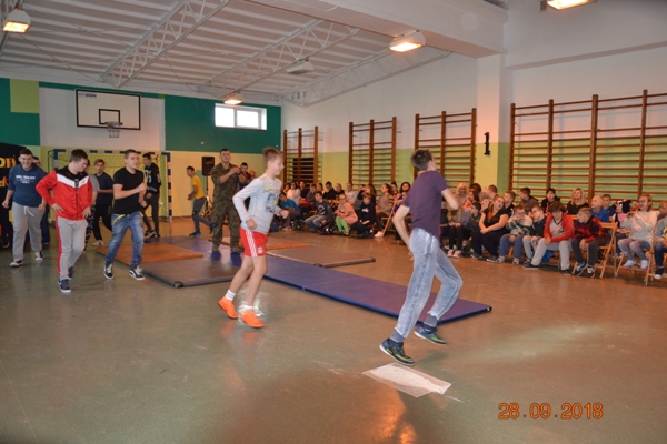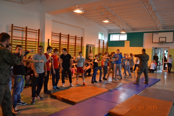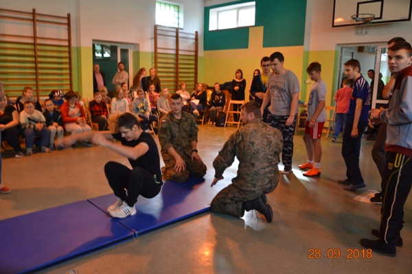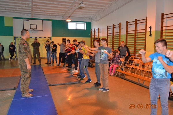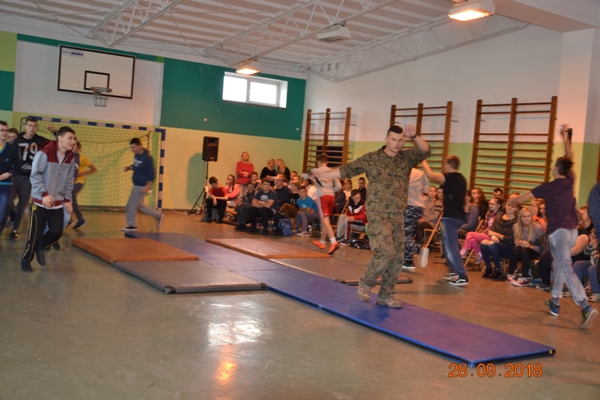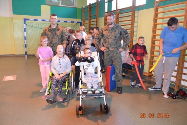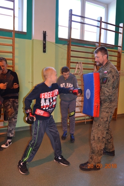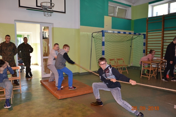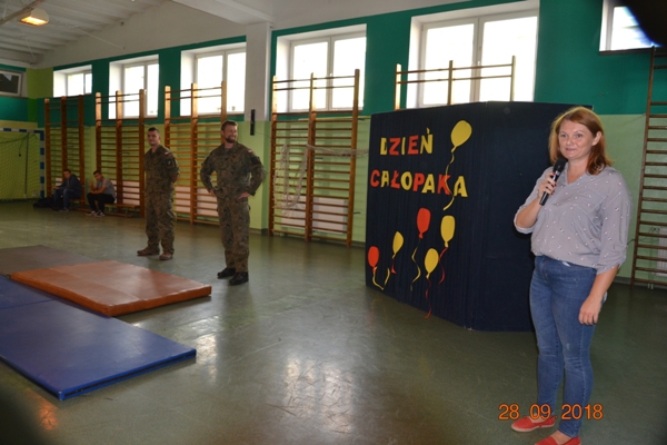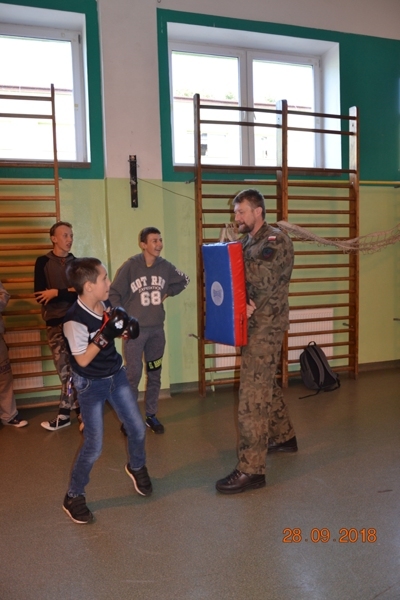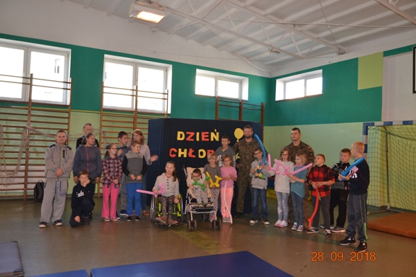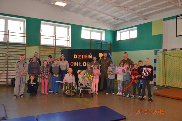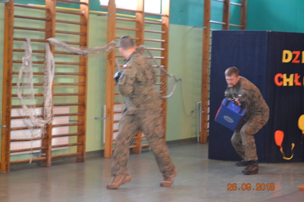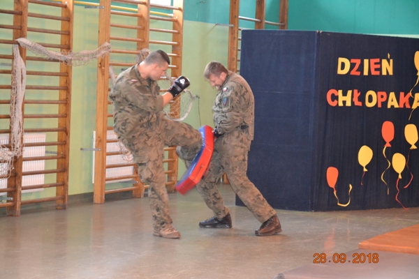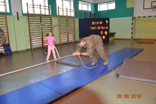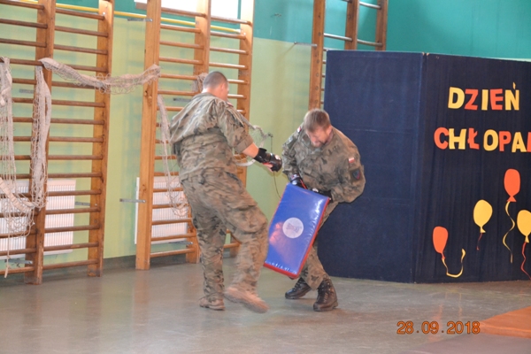 W miniony piątek w wyjątkowy sposób świętowaliśmy Dzień Chłopaka. W spotkaniu uczestniczyli żołnierze z 2 Hrubieszowskiego Pułku Rozpoznawczego im. mjr. Henryka Dobrzańskiego „Hubala”. Nasi goście przeprowadzili pokaz samoobrony oraz zaprawę wojskową dla ochotników. Uczniowie brali czynny udział w proponowanych ćwiczeniach, świetnie się przy tym bawiąc. W czasie spotkania można było również obejrzeć sprzęt wojskowy. Panie Animatorki z Klubu 2. Pułku Rozpoznawczego przygotowały atrakcje dla najmłodszych. Radość sprawiły dzieciom: malowanie twarzy i tatuaży zwierzątka z baloników oraz zabawy z chustą.