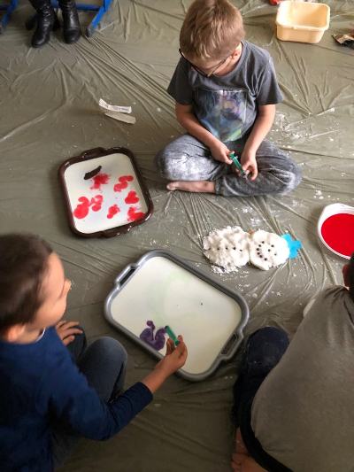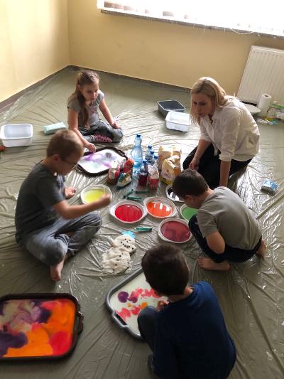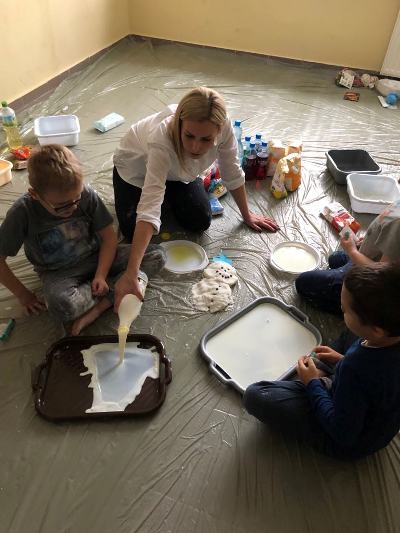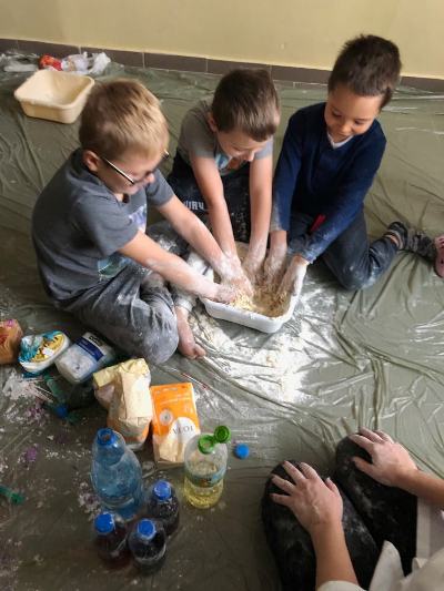 Dzieci miały okazję obserwować, jak materiał, który jest suchy i sypki zmienia się w mokry i kleisty, a następnie w miękki i stały. Poznały sposoby przemiany materiałów i produktów, kształtując jednocześnie swoje zdolności manualne. Wykonały między innymi „sztuczny śnieg”, ciecz nienewtonowską, kolorową ciastolinę. Dużo frajdy miały także podczas „malowania na mleku”, tworząc swój niepowtarzalny „obraz”. Wyobraźnia dzieci nie miała granic, powstawały cuda.