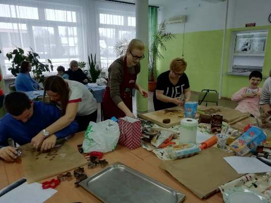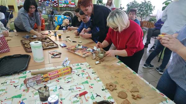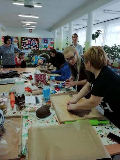 Właśnie z tej okazji dnia 14.12.2018 r. dla rodziców dzieci z zespołów rewalidacyjno-wychowawczych oraz nauczycieli uczących w zespołach zostały zorganizowane świąteczne warsztaty kulinarne. Uczniowie wspólnie z rodzicami i nauczycielami ugniatali, wałkowali oraz wykrawali pięknymi świątecznymi foremkami ciasto. Dużym wyzwaniem dla rodziców było dekorowanie upieczonych ciasteczek. Jak się później okazało rodzice wykazali się ogromnym talentem plastycznym i wielką wyobraźnią dekoratorską. Powstały naprawdę przepiękne i oryginalne piernikowe dekoracje. Wszyscy z wielką radością smakowali wspólne wypieki a dzięki wspaniałemu zapachowi rozchodzącemu się po sali uczestnicy warsztatów poczuli magię nadchodzących świąt. Spotkanie było doskonałą okazją dla rodziców oraz dzieci do integracji, miłego spędzenia czasu oraz wspólnej zabawy. Zajęcia przebiegały w miłej i serdecznej atmosferze, umiliły dzieciom oczekiwanie na święta i wprowadziły nas wszystkich w świąteczny nastrój.