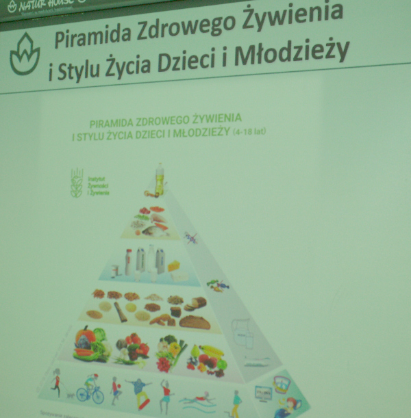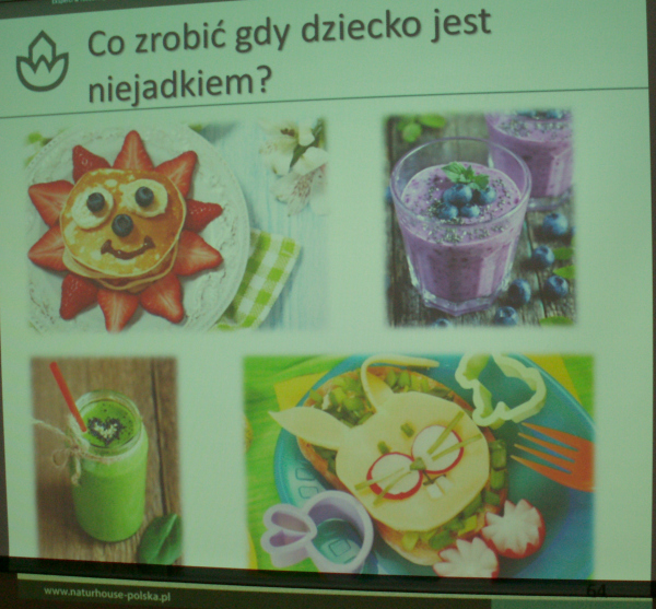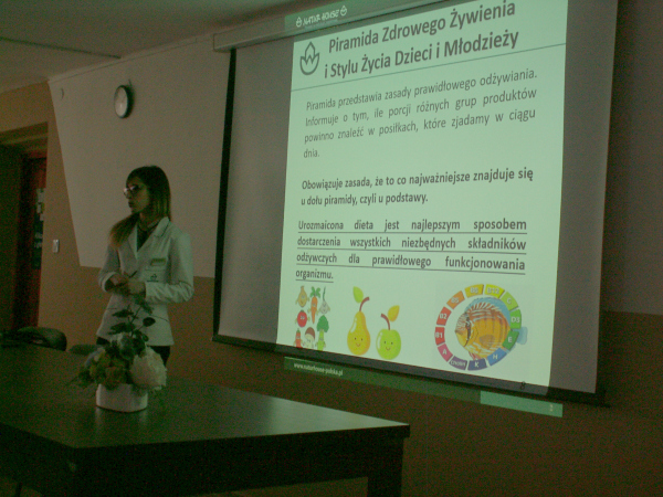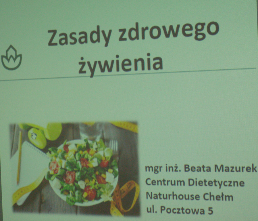 Pani inż. Beata Mazurek, dietetyk Natur House z Chełma, wygłosiła prelekcję na temat właściwych nawyków żywienia. Zwróciła uwagę jak ważne jest zdrowe i racjonalne odżywianie. Swoje wypowiedzi uzupełniła o atrakcyjną prezentację multimedialną. Zachęcała, aby komponować pełnowartościowy jadłospis dla dzieci i całej rodziny. Zwróciła uwagę na bardzo ważną rzecz jaką jest wspólny posiłek, nie pomoże dieta jeśli sami będziemy jeść inne posiłki niż dziecko. Prelekcja uświadomiła rodzicom, jak poważne konsekwencje mogą wyniknąć, z nieprawidłowego odżywiania się - otyłość, zaburzenia w koncentracji, kłopoty w nauce, choroby nerek, nadciśnienie itp. Rodzice bardzo uważnie wysłuchali rad pani dietetyk, zadawali pytania dotyczące kwestii żywienia.