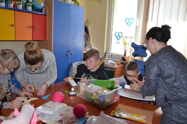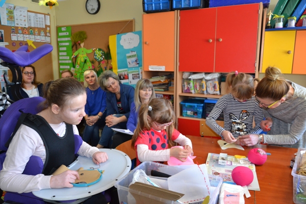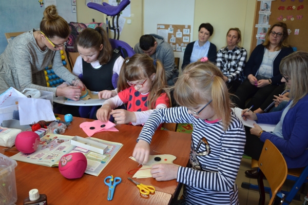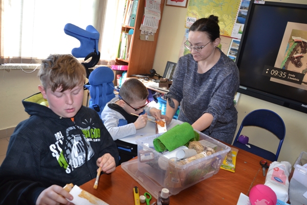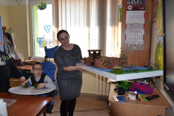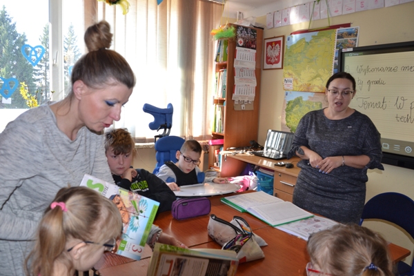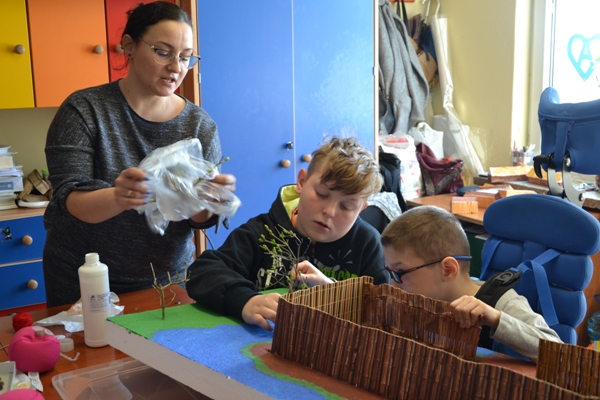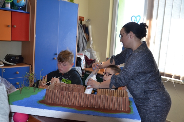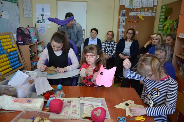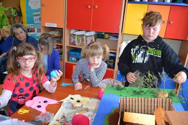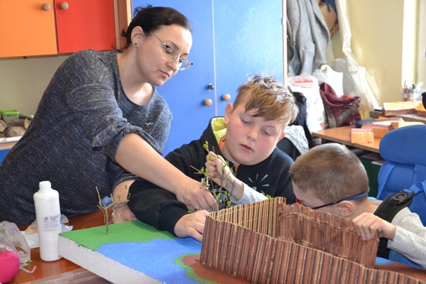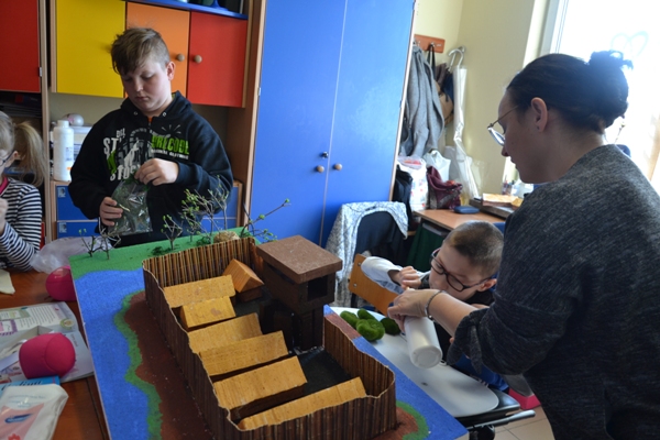 Dnia 3.04.2019 r. w klasie II-III SP nauczycielka Marzena Nowak przeprowadziła zajęcia otwarte z edukacji i zajęć technicznych pod tytułem „W pracowni techniczno – krawieckiej”. Celem lekcji była praca w zespole podczas uzupełniania makiety grodu (dla klasy drugiej) oraz szycie zabawki– różnymi ściegami i przyszywanie guzików (dla klasy trzeciej).