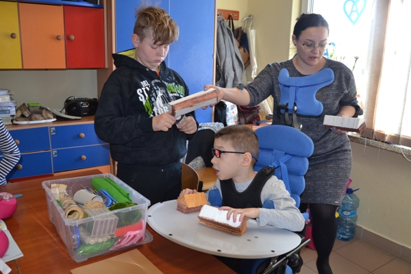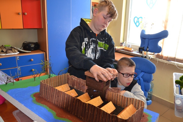 Uczniowie aktywnie włączyli się w zajęcia, mieli okazję ćwiczyć szycie różnymi sposobami (dzierganym, fastrygowym, na okrętkę oraz przyszywać guziki). Młodsi zapełnili makietę grodu różnymi elementami (domki, wieżyczka, drzewka, mech, itp.)