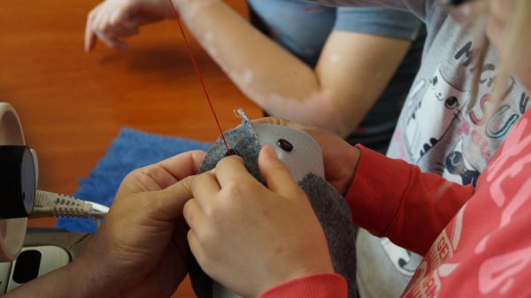 Następnie uczniowie krok po kroku obserwowali tajniki krawiectwa. Podczas spotkania pani krawcowa wykonała dla uczniów zabawkę myszkę z filcu. Dzieci miały okazję zobaczyć jak stosuje, używa swoje przybory w praktyce. Utrwaliły sobie umiejętność przyszywania guzików.