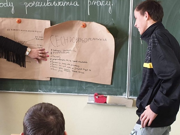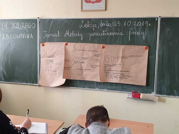 W dniu 25.10.2019r. odbyła się lekcja otwarta w klasie I Kucharz Branżowej Szkole I Stopnia z przedmiotu:Podstawy przedsiębiorczości przeprowadzona przez Panią Milenę Szczucką.Tematem lekcji były:"Metody poszukiwania pracy". Podczas zajęć uczniowie zdobyli wiadomości na temat rynku pracy i bezrobocia.Dyskutowano na temat: Co należy zrobić aby zaistnieć we współczesnym rynku pracy ?, jak się dobrze zaprezentować ?, jak prawidłowo napisać CV ? Następnie uczniowie w grupach 2 osobowych mieli możliwość zastanowienia się nad cechami dobrego pracownika i wypisania na szarym papierze cech najbardziej pożądanych przez pracodawców a później zaprezentowania ich na forum klasy. Po tym etapie wspólnie z nauczycielem młodzież wymieniała przykładowe metody poszukiwania pracy i po krótce każda z metod była opisywana.Następnie wszyscy uczniowie dostali przykładowe druki ogłoszeniowe przyniesione ze sklepu, na których mieli możliwość napisania samodzielnie przykładową ofertę pracy z uwzględnieniem zasad pisania ogłoszeń, po tym zadaniu uczniowie dostali laptop z dostępem do internetu i wyszukiwali przykładowe strony internetowe w poszukiwaniu pracy z uwzględnieniem ofert pracy znajdującymi się w naszym regionie, a także znalezienie ofert pracy w PUP w Hrubieszowie, jak również wyszukanie zawodów najbardziej popularnych w 2018 r. Podsumowaniem zajęć była krótka anonimowa ankieta przygotowana do wypełnienia przez uczniów w celu sprawdzenia własnej ewaluacji pracy nauczyciela.Lekcja przebiegała w przyjaznej atmosferze z wykorzystaniem różnych metod pracy, co pozwoliło uczniom zaangażować się w pracę i wykonanie zadania.