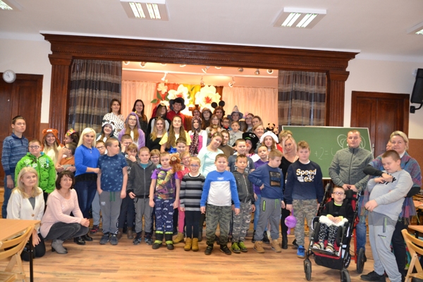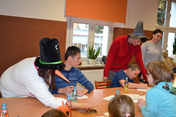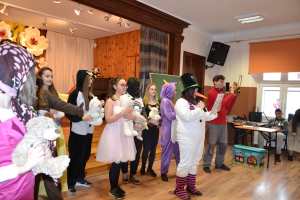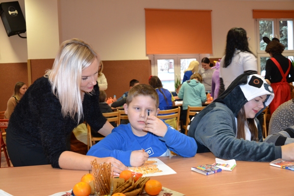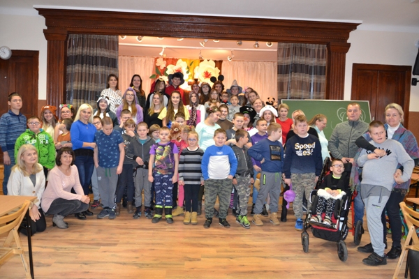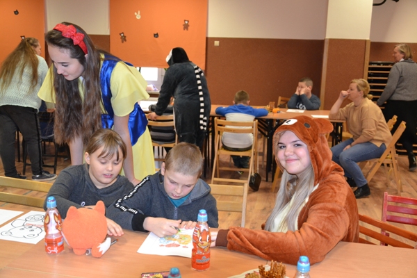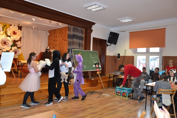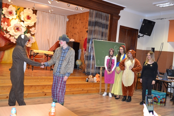 Uczniowie szkoły podstawowej naszego Ośrodka w poniedziałkowe przedpołudnie zostali zaproszeni na wyjątkową uroczystość zorganizowaną przez młodzież z klasy I D3, I Liceum Ogólnokształcącego im. Ks. Stanisława Staszica w Hrubieszowie. Okazją do przemiłego spotkania był Światowy Dzień Pluszowego Misia. Licealiści przygotowali bajkowe przedstawienie z uroczym misiem i jego rodzinką w roli głównej i wielobarwnym orszakiem kolorowych postaci. Wspólnie malowaliśmy misie, którymi dekorowaliśmy salę. Następnie była misiowa uczta, tańce oraz zabawy z chustą i kolorowym tunelem. Młodzież zaprosiła nas ponownie na przedstawienie. Tym razem była to pantomima opowiadająca historię narodzin pluszowego przyjaciela. Wszyscy uczestnicy spotkania zostali zaproszeni do kina na ciekawe przygody Misia Uszatka oraz zabawne spotkanie z Maszą i niedźwiedziem. Serdecznie dziękujemy uczniom klasy I D3 oraz pani Ani Pękowskiej.