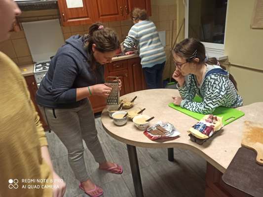 Grupa II nie lubi sie nudzić! Wychowanki chętnie poznaja tajniki kulinarne. Przygotowują smaczne desery, pieką ciasta, szykują kanapki. Oprócz kucharzenia dbają też o rośliny. Uczą się jak przesadzać i pielęgnować kwiaty doniczkowe, które później pięknie dekorują sale sypialne oraz inne pomieszczenia internatu. Róznorodne zajęcia mają na celu doskonalenie umiejętności, podnoszenie samodzielności oraz sprawianie uczestnikom wiele radości. Po zajęciach wychowanki chętnie wychodzą na spacery, podczas których obserwują środowisko. Jedną z atrakcji w czasie spacerów jest karmienie kaczek, tak licznie zamieszkujacych nad rzeką Huczwą.