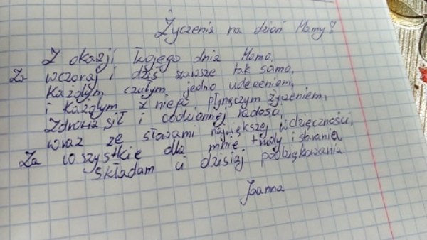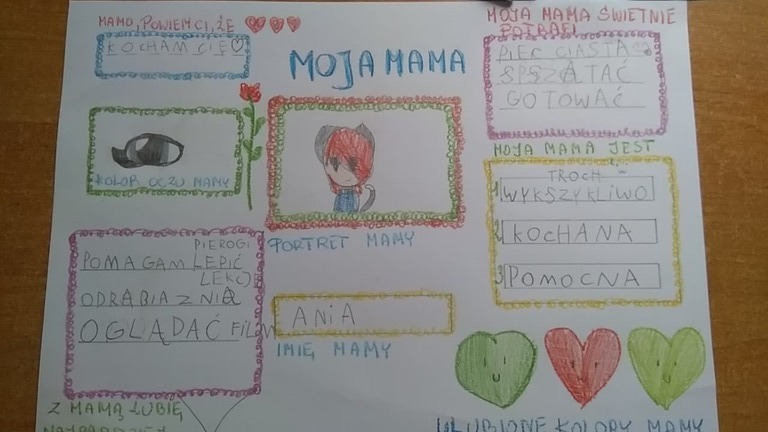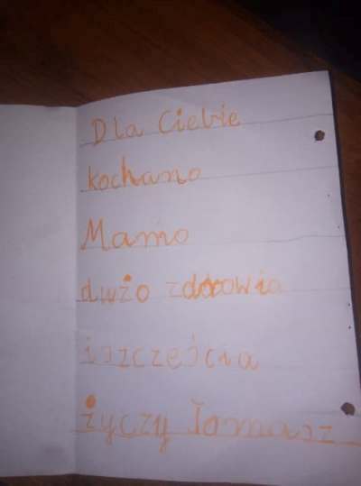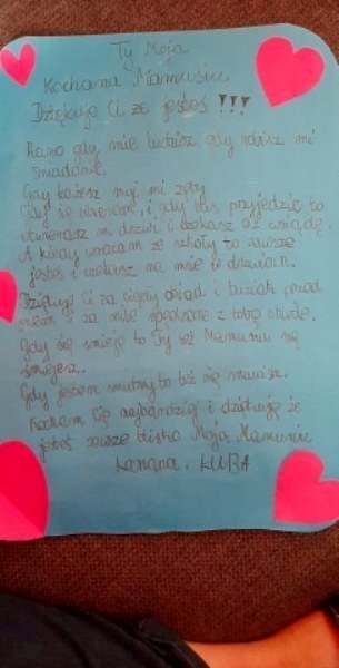Rano gdy mnie budzisz, gdy robisz mi śniadanie. Gdy karzesz mi myć zęby. Gdy ubieram się i gdy bus przyjedzie to otwierasz mi drzwi i czekasz, aż wsiądę. A kiedy wracam ze szkoły to zawsze jesteś i czekasz na mnie w drzwiach. Dziękuję Ci za ciepły obiad i buziaki przed snem i za miłe spędzone z Tobą chwile. Gdy się śmieję to Ty też mamusiu się śmiejesz. Gdy jestem smutny to też się smucisz. Kocham Cię najbardziej i dziękuję, ze Jesteś blisko Moja Mamusiu Kochana! Kuba