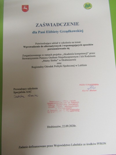 W ramach projektu „Akademia kompetencji” współfinansowanego przez Regionalny Ośrodek Polityki Społecznej w Lublinie i Województwo Lubelskie w dniach 22-23.09.2020 r. zrealizowano dla rodziców i opiekunów dzieci niepełnosprawnych szkolenie „Wprowadzenie do alternatywnych i wspomagających sposobów porozumiewania się” oraz warsztaty „Diagnoza możliwości komunikacyjnych dziecka. Tworzenie pomocy komunikacyjnych”. Celem spotkań było przekazanie wiedzy na temat alternatywnych i wspomagających sposobów porozumiewania się oraz rozbudzenie świadomości rodziców i opiekunów o możliwościach rozwoju komunikacji u swoich dzieci. Uczestnicy zostali zapoznani ze sposobami diagnozy możliwości komunikacyjnych oraz przykładowymi pomocami i strategiami służącymi porozumiewaniu. Położono nacisk na konieczność rozwijania umiejętności kluczowych kształtujących komunikację i umiejętności społeczne, zwiększających szansę na pojawienie się mowy. Spotkania zakładały oddziaływanie na rodzica, opiekuna i podwyższenie poziomu współpracy i zaangażowania w realizację zadań, w efekcie powodzenie w terapii.