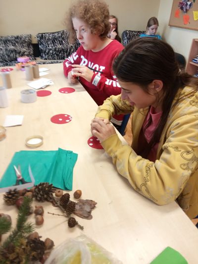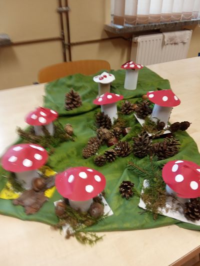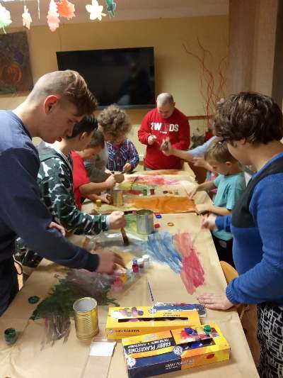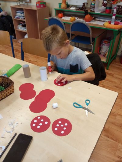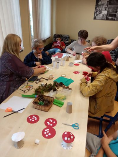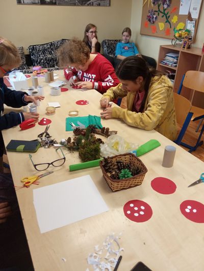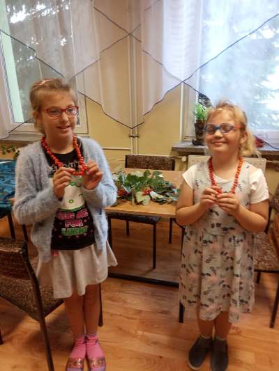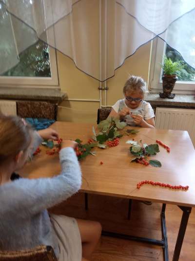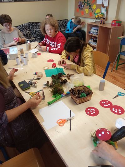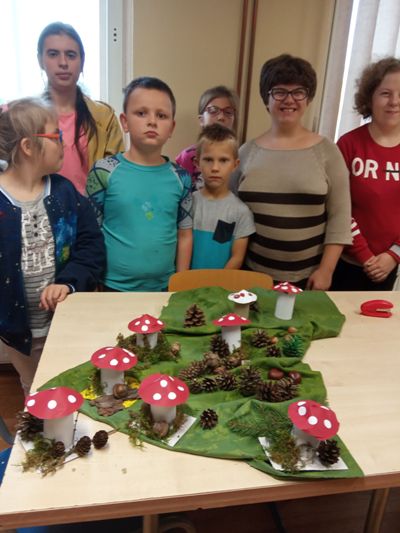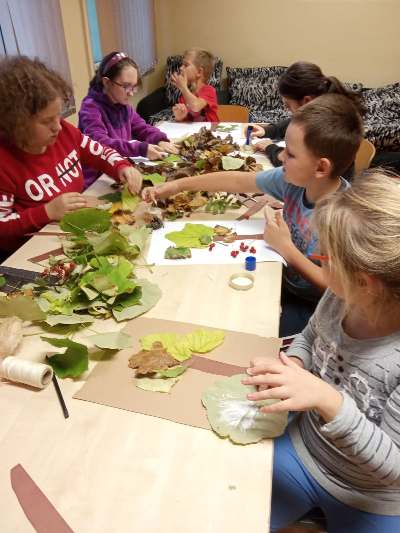 W barwach jesieni wychowankowie grupy I i V spędzali popołudnia w internacie. Obserwując zmiany zachodzące w przyrodzie, zachwyceni pięknem tak barwnej pory roku z wielkim zaangażowaniem wykonywali prace plastyczne wykorzystując różnorodne techniki oraz własne zdolności i kreatywność. W ramach cyklu warsztatów dzieci wykonały czerwone korale, jesiennego muchomora, jesienne drzewa oraz prace na konkurs "Kolory jesieni". Przeprowadzone warsztaty to bardzo aktywnie i twórczo spędzony czas wychowanków. W czasie zajęć nastąpiła również integracja wychowanków dwóch grup wychowawczych, zacieśniły się koleżeńskie więzi.