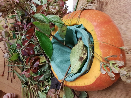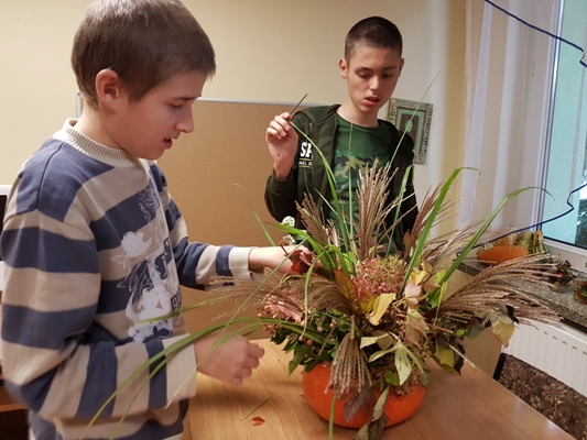 Jesień to piękna i barwna pora roku. Przynosi obfitość materiałów do tworzenia pięknych dekoracji. Przebarwione liście, kwiaty, gałązki, suche trawy oraz dynia stały się inspiracją dla II grupy. Wykorzystując zebrany materiał przyrodniczy wykonaliśmy jesienny bukiet, który jeszcze przez długi czas będzie ozdobą naszej świetlicy. Podczas zajęć wychowankowie rozwijają swoje zainteresowania przyrodnicze, pogłębiają wiadomości o jesieni, wzbogacają doświadczenia plastyczne, rozwijają wyobraźnię oraz aktywnie uczestniczą w tworzeniu barwnej kompozycji.