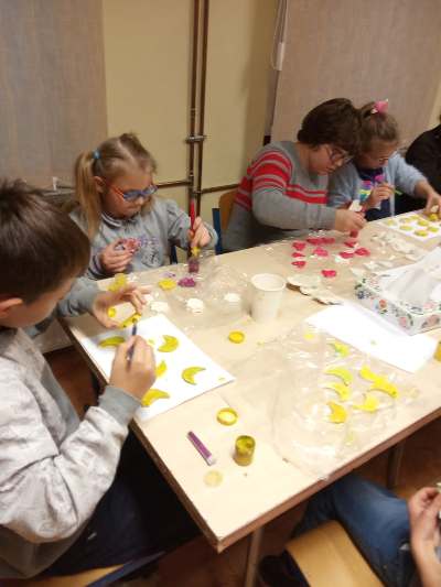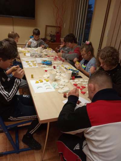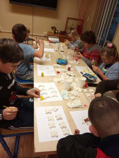 Wykorzystanie masy solnej jest kreatywnym sposobem na ciekawe zajęcia, które doskonalą umiejętności manualne dłoni i palców, rozwijają wyobraźnię i aktywność twórczą wychowanków. Dodatkowym plusem masy solnej jest to, że można ją pomalować i nadać odpowiednią formę. Tematem naszych zajęć były ozdoby świąteczne. Wychowankowie tworzyli z masy solnej anioły, gwiazdki, księżyce, serduszka po wysuszeniu prace były malowane farbami plakatowymi i akrylowymi. Zabawa z masą solną była bardzo udana i wywołała wiele radości twórczej.