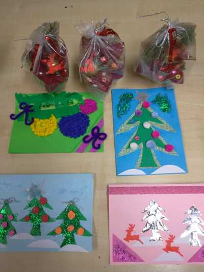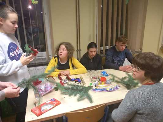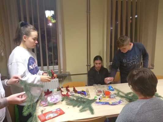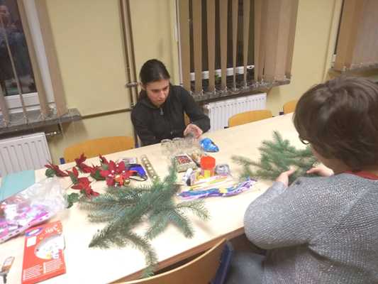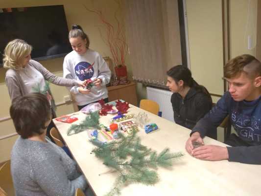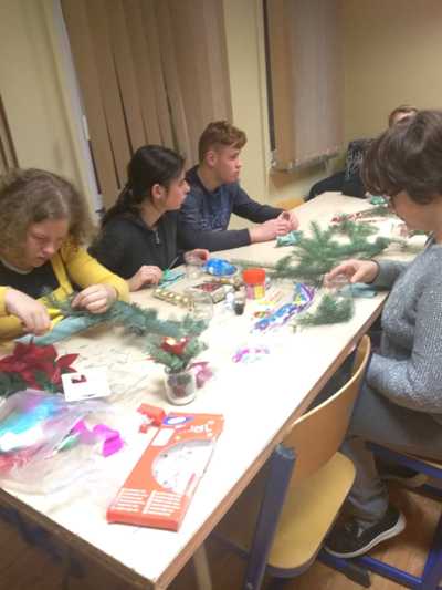 Wychowankowie grupy V w ramach świątecznych przygotowań wykonali stroiki oraz karty bożonarodzeniowe. Celem zajęć było rozwijanie kreatywnego myślenia oraz usprawnianie funkcji manualnych uczestników. Przygotowane prace zostały przekazane rodzicom wychowanków wraz z życzeniami z okazji Świąt Bożego Narodzenia. Zajęciom towarzyszyła miła atmosfera, wszyscy pracowali aktywnie i z zaangażowaniem.