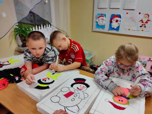 Opanowanie technik plastycznych prowadzi do pobudzenia wyobraźni i doskonalenia zdolności manualnych, które są niezbędne w kształtowaniu kreatywnego myślenia. Idealnym zadaniem do wykonania na zajęciach z wychowankami doskonalącym wyżej wymienione umiejętności jest np. Kinusayga – japoński patchwork bez igły. Jest to ciekawa technika, która nie wymaga zbyt dużego nakładu finansowego, a efekty pracy mogą zaskakiwać. Jak ciekawa jest to sztuka przekonali się o tym wychowankowie z grupy I, którzy z dużym zaangażowaniem wybrali wzór, a następnie dobierali i docinali kolorowe skrawki tkanin do poszczególnych elementów odrysowanego wzoru, co w rezultacie przyczyniło się do powstania pięknych prac.