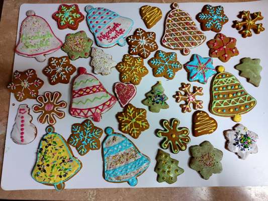 Święta Bożego Narodzenia są dla wszystkich, a szczególnie dla naszych wychowanków radosnym przeżyciem. Już sam czas przygotowań wywołuje wiele emocji. W grupie II przygotowania do świąt trwają już od połowy listopada. Przystroiliśmy naszą świetlicę samodzielnie wykonanymi ozdobami: zrobiliśmy podświetlane dekoracje na okna, stroik na stół, „szklaną kulę” ze słoika, wianek, który ozdabia drzwi naszej świetlicy oraz wiele innych ozdób na choinkę. Na zajęciach wychowankowie poznawali tradycje związane ze Świętami Bożego Narodzenia, poznali zasady redagowania życzeń świątecznych, wykonali kartki świąteczne, które wraz z życzeniami zawiozą na święta do swoich domów rodzinnych. Podczas poznawania polskich tradycji świątecznych wychowankowie śpiewali znane kolędy i pastorałki. Czas przygotowań do świąt nie tylko rozbrzmiewał śpiewem, ale również pachniał przyprawami korzennymi. Na zajęciach kulinarnych wychowankowie zgłębiali tajniki przepisu na ciasto piernikowe oraz samodzielnie łączyli składniki. Wiele radości sprawiło wychowankom wałkowanie ciasta, wycinanie pierników foremkami oraz lukrowanie i ozdabianie ciastek według własnej wyobraźni. Przystrojone pierniczki po zapakowaniu w ozdobne woreczki zostaną przekazane najbliższym wychowanków w czasie Świąt Bożego Narodzenia. Celem cyklu zajęć przygotowujących do świąt było: - kultywowanie tradycji świątecznych, - rozwijanie kreatywności i wyobraźni twórczej, - usprawnianie motoryki małej, - nabywanie umiejętności łączenia składników według przepisu, - utrwalanie nawyków higienicznych podczas zajęć kulinarnych.