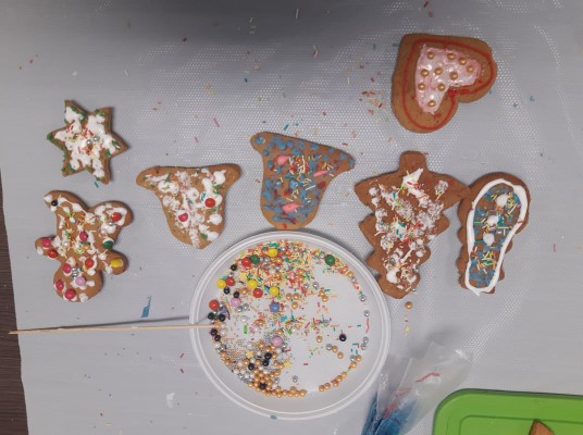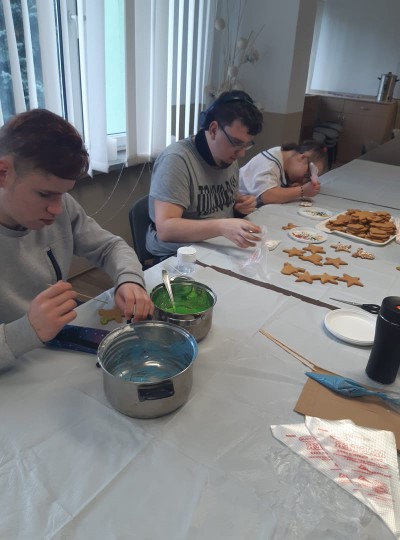 W dniu 15 grudnia odbyły się warsztaty artystyczne dla uczniów klas pdp. Tematem przewodnim były dekoracje świąteczne- ozdabianie pierniczków i wykonywanie stroików. Uczniowie dekorowali pierniki własnoręcznie przygotowanym kolorowym lukrem oraz różnymi posypkami. Potem wykonywali pod okiem nauczycieli stroiki świąteczne wykorzystując materiały naturalne takie jak gałązki świerku, szyszki,wysuszone pomarańcze itd. Pieniądze że sprzedaży dekoracji zasilą szkolny fundusz wycieczkowy. Spotkanie warsztatowe było okazją do poznania różnych technik dekoracyjnych oraz miłego spędzenia wspólnie czasu, oczywiście przy przestrzeganiu zaleceń sanitarnych.