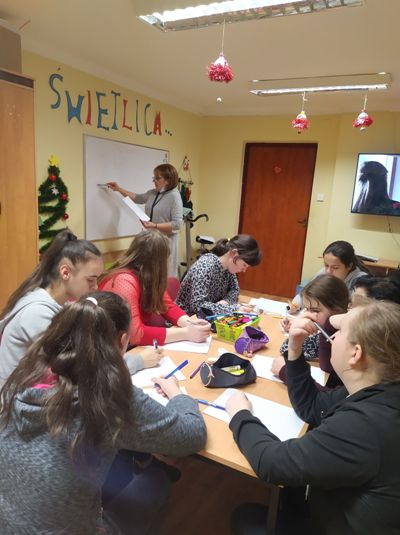Czas popołudniowy w internacie to nie tylko zajęcia kulinarne, artystyczne, plastyczne czy profilaktyczne. Dużo czasu dziewczęta z grupy VI poświęcają na naukę i przygotowanie się do zajęć. Jest więc czas na naukę ale i też na zabawę. Okazją do odpoczynku po lekcjach zawsze są zajęcia rozwijające zainteresowania jak również aktywność na świeżym powietrzu. Ostatnio każdą, wolną chwilę dziewczęta uwielbiają spędzać aktywnie wykorzystując wspaniałe warunki pogodowe, bo tak urokliwej zimy już dawno nie było! Staramy się tak gospodarować czasem aby wychowanki dużo odpoczywały realizując swoje zainteresowania i nie zaniedbywały przy tym codziennych obowiązków.