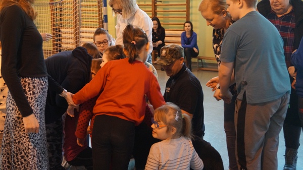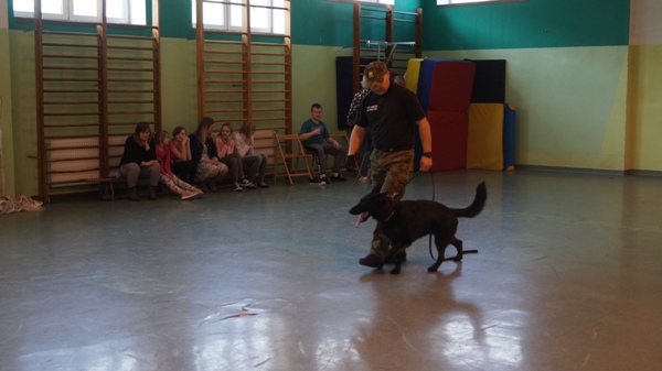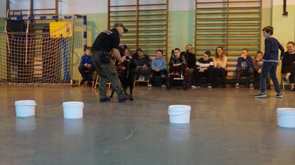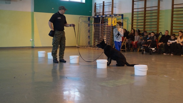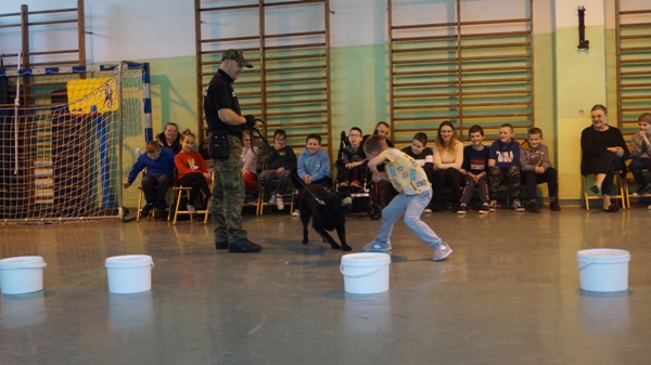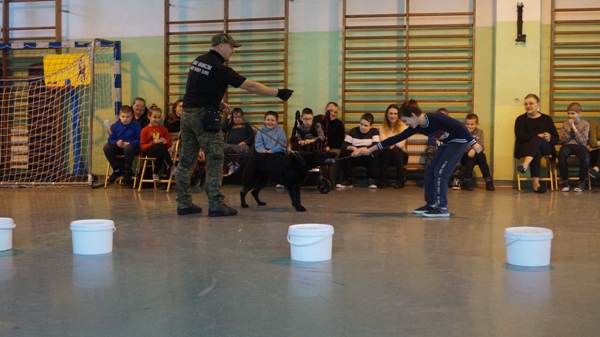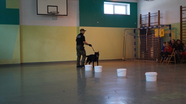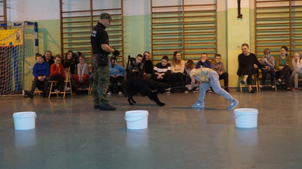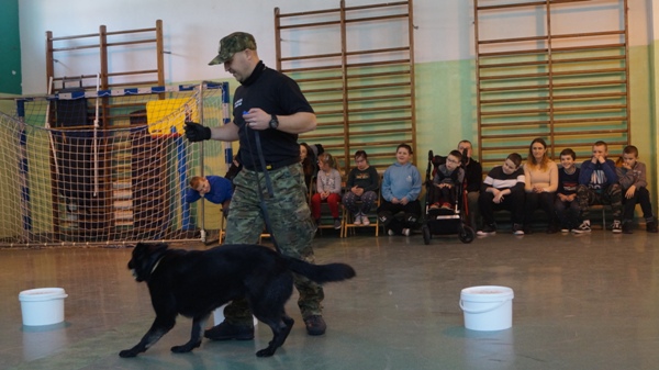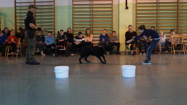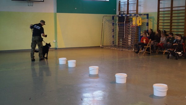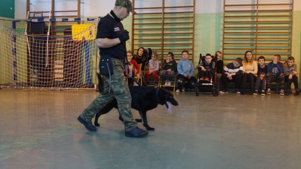 26 lutego 2021 r. uczniowie naszej szkoły spotkali się z Funkcjonariuszami Placówki Straży Granicznej w Hrubieszowie. Młodzież uczestniczyła w spotkaniu z panią sierż. szt. SG Kornelią Berchard i panią sierż. szt. SG Anetą Wolińską, które omówiły trudny i bardzo ważny temat „Handel ludźmi”. Młodsi uczniowie mieli okazję zobaczyć pokaz wykrywania substancji wybuchowych oraz środków odużających przez Tosię - psa do zadań specjalnych, przygotowanego przez pana st. chor. szt. SG Szymona Palonkę. Dzieci posłuchały o tym jak specjalnie szkolone psy wspomagają pracę funkcjonariuszy straży granicznej. Tosia to wspaniale wytresowany pies, chętnie pozowała do pamiątkowych zdjęć.