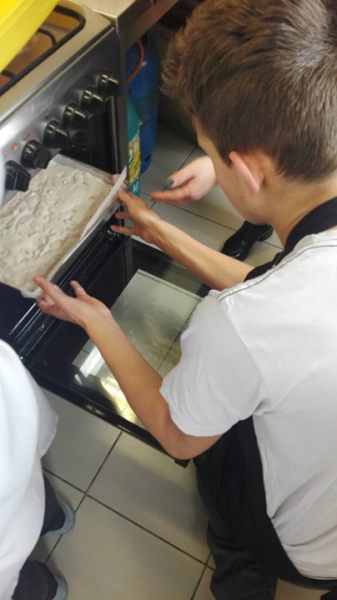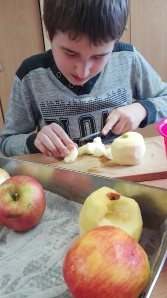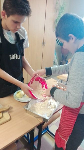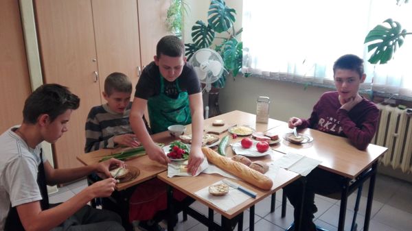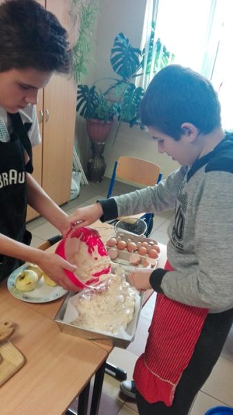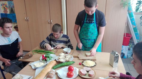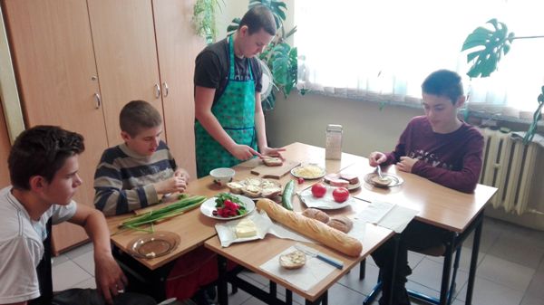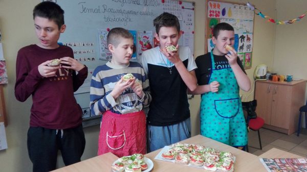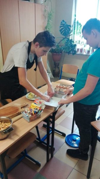 Realizując zajęcia profilaktyki zdrowego odżywiania uczniowie klasy VI i VII podczas zajęć kulinarnych własnoręcznie wykonali pożywne, wieloskładnikowe kanapki. Chłopcy przeanalizowali piramidę zdrowego odżywania. Na przygotowanych kanapkach znalazły się składniki według zalecanych proporcji. Nasi kucharze polecają tak przygotowane zielone przekąski na drugie śniadanie. W tym tygodniu zaś wzbogacili swoją wiedzę i doświadczenie na temat wartości odżywczych i zastosowania jabłek w codziennym jadłospisie. Zwieńczeniem zajęć była wspólna degustacja szarlotki. Zachęcamy do częstszego sięgania po nasze, krajowe owoce.