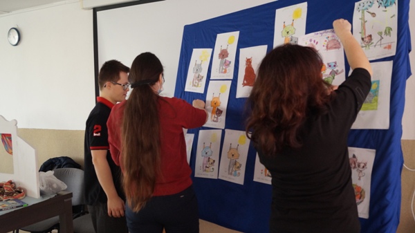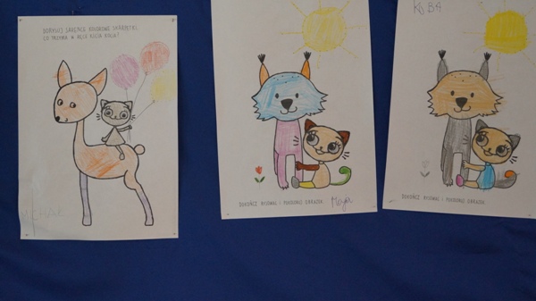 W czwartek 04.03.2021 r. gościliśmy w naszej szkole Teatrzyk Zielony Kot. Pani Ania i Pani Marzenka na co dzień pracujące w Miejskiej Bibliotece Publicznej „Zielony Kot”, przygotowały dla naszych uczniów pacynkowe przedstawienie bajki pt. „Praktyczny pan“. Po obejrzeniu teatrzyku uczniowie wykonali prace plastyczne, malując swojego domowego kota. Wszystkie rysunki zostały wyeksponowane na tablicy szkolnej, przy której uczestnicy tego miłego spotkania zebrali się w celu wykonania pamiątkowej fotografii.