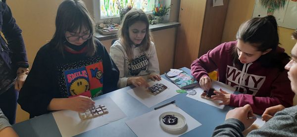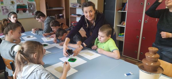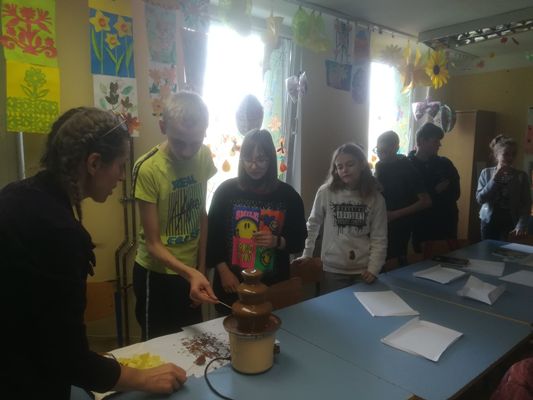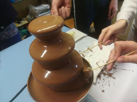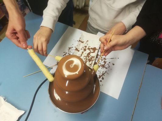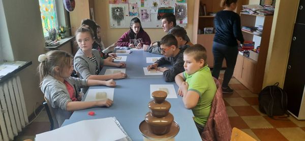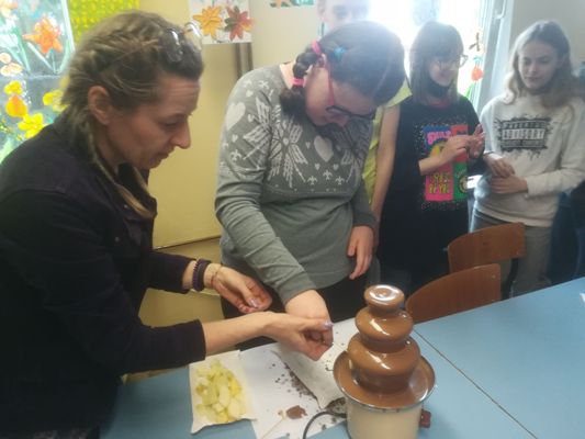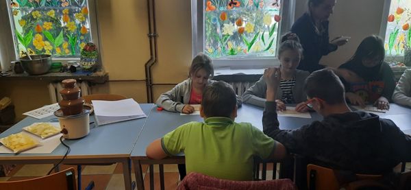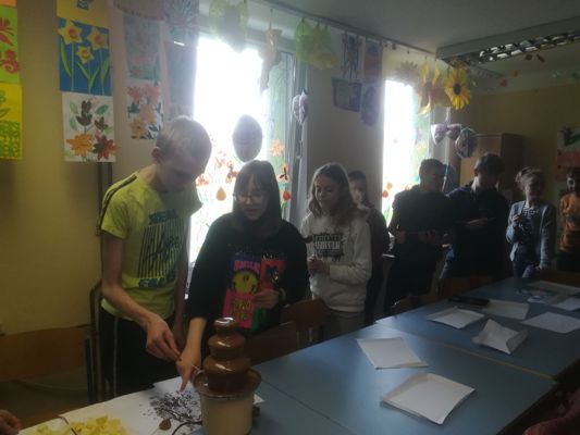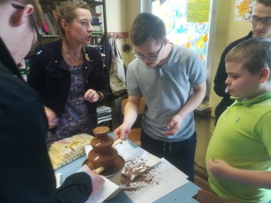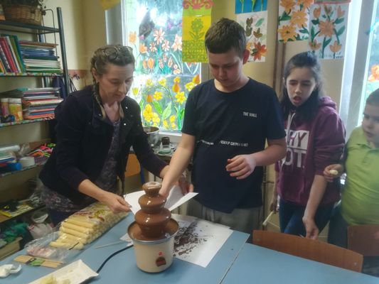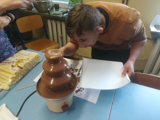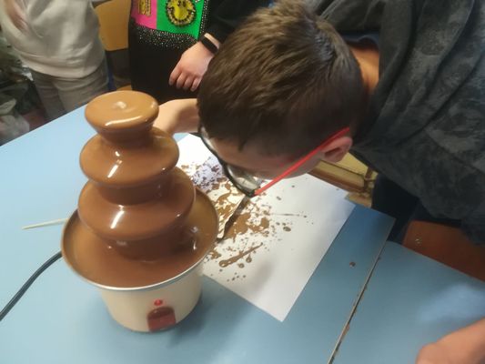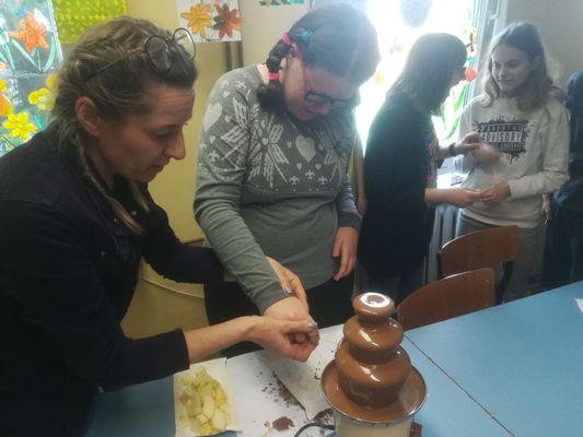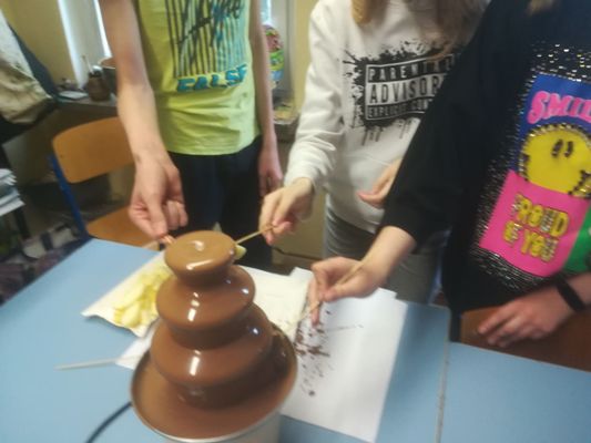 Dla łasuchów i wielbicieli czekolady jest dobra wiadomość - czekolada obchodzi swoje święto kilka razy w roku. Np. 7 lipca przypada Światowy Dzień Czekolady i tę uroczystość obchodzi się co roku z okazji rocznicy wprowadzenia czekolady do Europy. Według bimkal.pl obchody Dnia Czekolady w dniu 12 kwietnia to typowo polskie święto. Statystyczny Polak zjada ponad 5 kg wyrobów z kakao rocznie. Początków kakaowej przekąski należy szukać w Ameryce Łacińskiej, ok. 4000 lat temu. Czekolada znana od kilku tysięcy lat, spożywana w przeróżnej formie, wspiera układ krążenia, poprawia samopoczucie i dobrze wpływa na organizm. Ma tysiące odmian, kształtów i kolorów. Wytwarzana jest z miazgi i tłuszczu kakaowego oraz dodatków takich jak: cukier, mleko w proszku, lecytyna sojowa. Nasi uczniowie w czasie zajęć świetlicowych uczcili Dzień Czekolady. Wysłuchali opowieści o czekoladowym przysmaku oraz wykonali tabliczki czekolady malując je czekoladą i dekorując według własnego pomysłu. I choć do jedzenia się nie nadają to wyglądają smakowicie. Po pracy, upragniona nagroda w postaci czekoladowej fontanny! Owoce, chrupki oblane płynną czekoladą były wyśmienite.