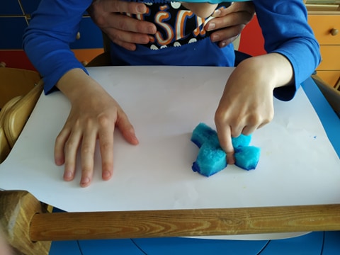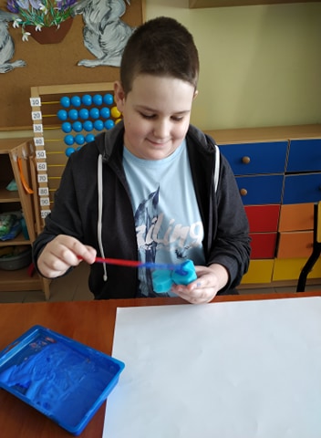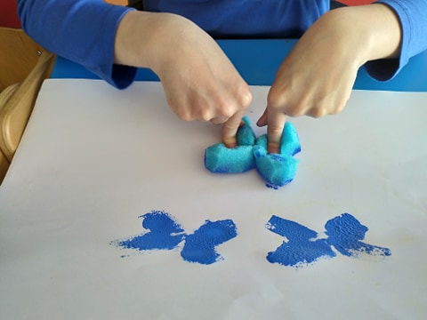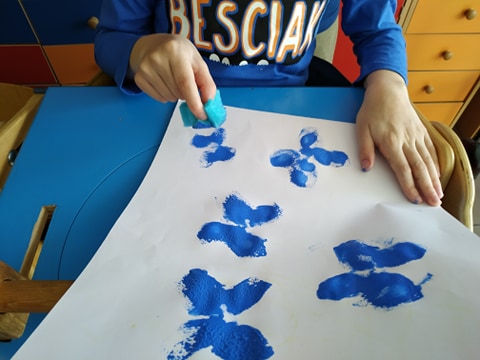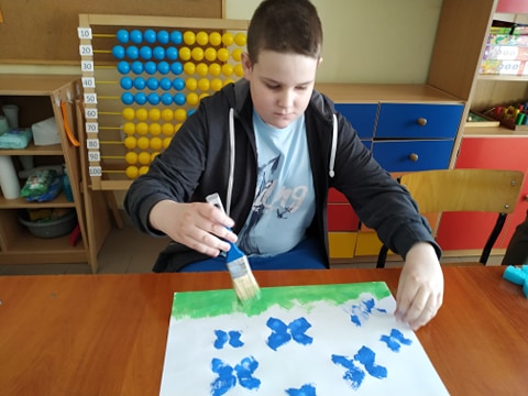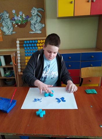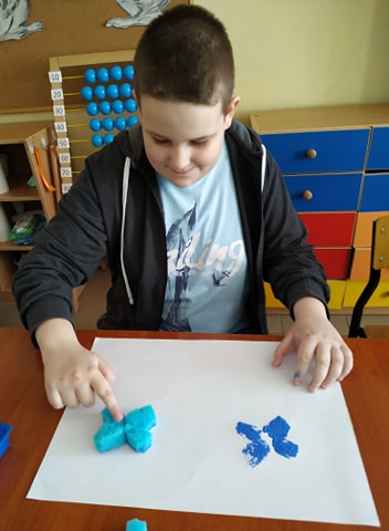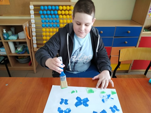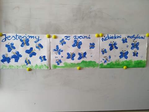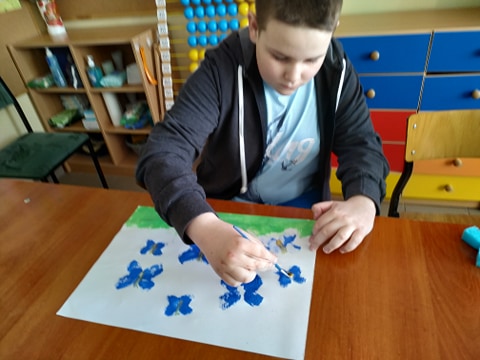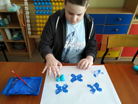 2. Wykonać pracę plastyczną np. odbić niebieskie ręce w kształcie motyla lub serca albo wykonać dowolną aktywność wg. własnej inwencji twórczej np. „taniec motyla".